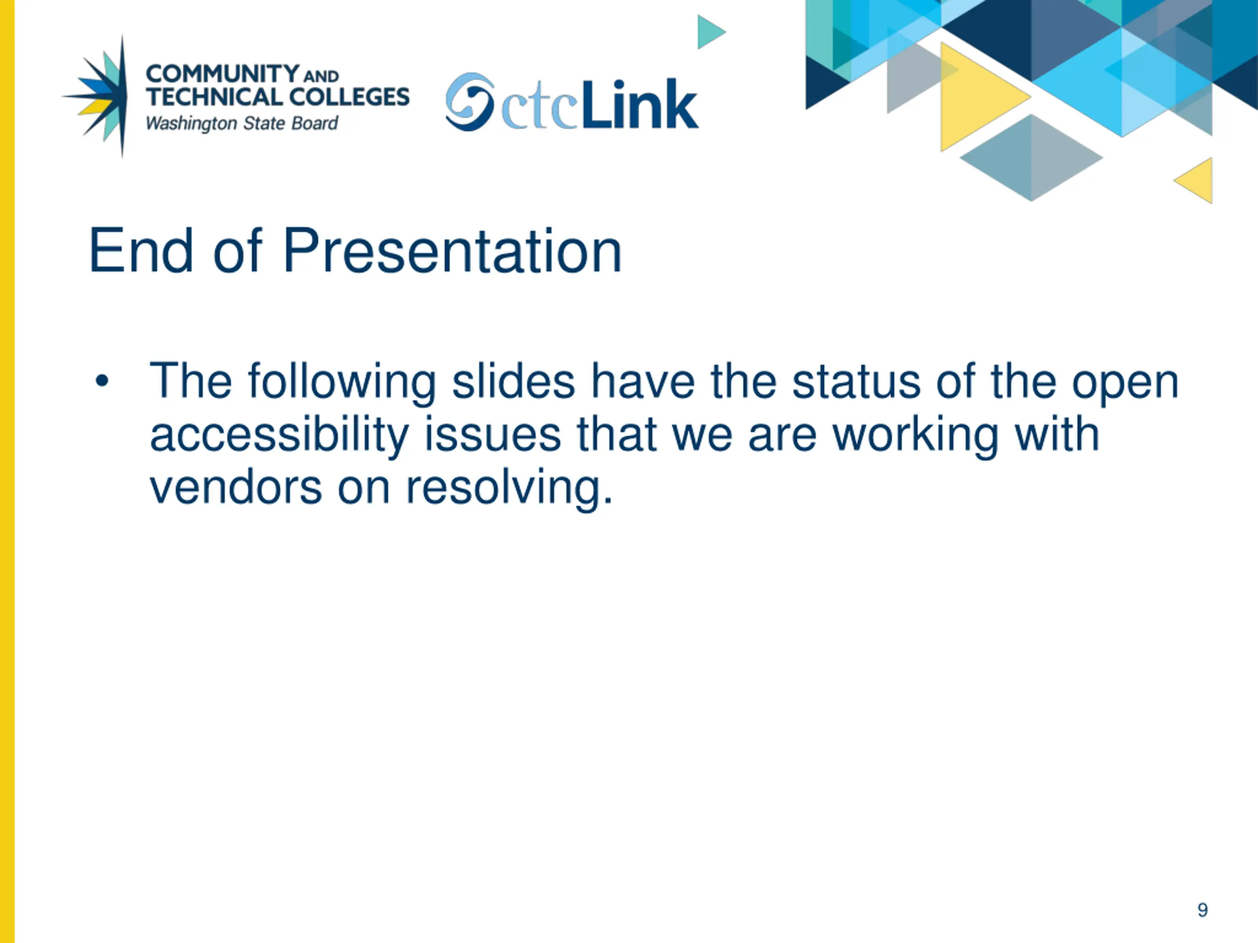 End of Presentation The following slides have the status of the open accessibility issues that we are working with vendors on resolving. 9