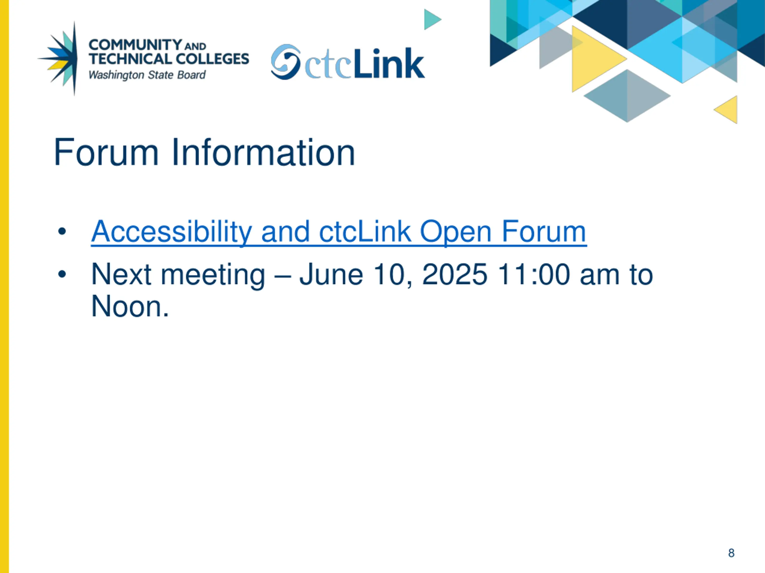 Forum Information Accessibility and ctcLink Open Forum Next meeting June 10, 2025 11:00 am to Noon. 8
