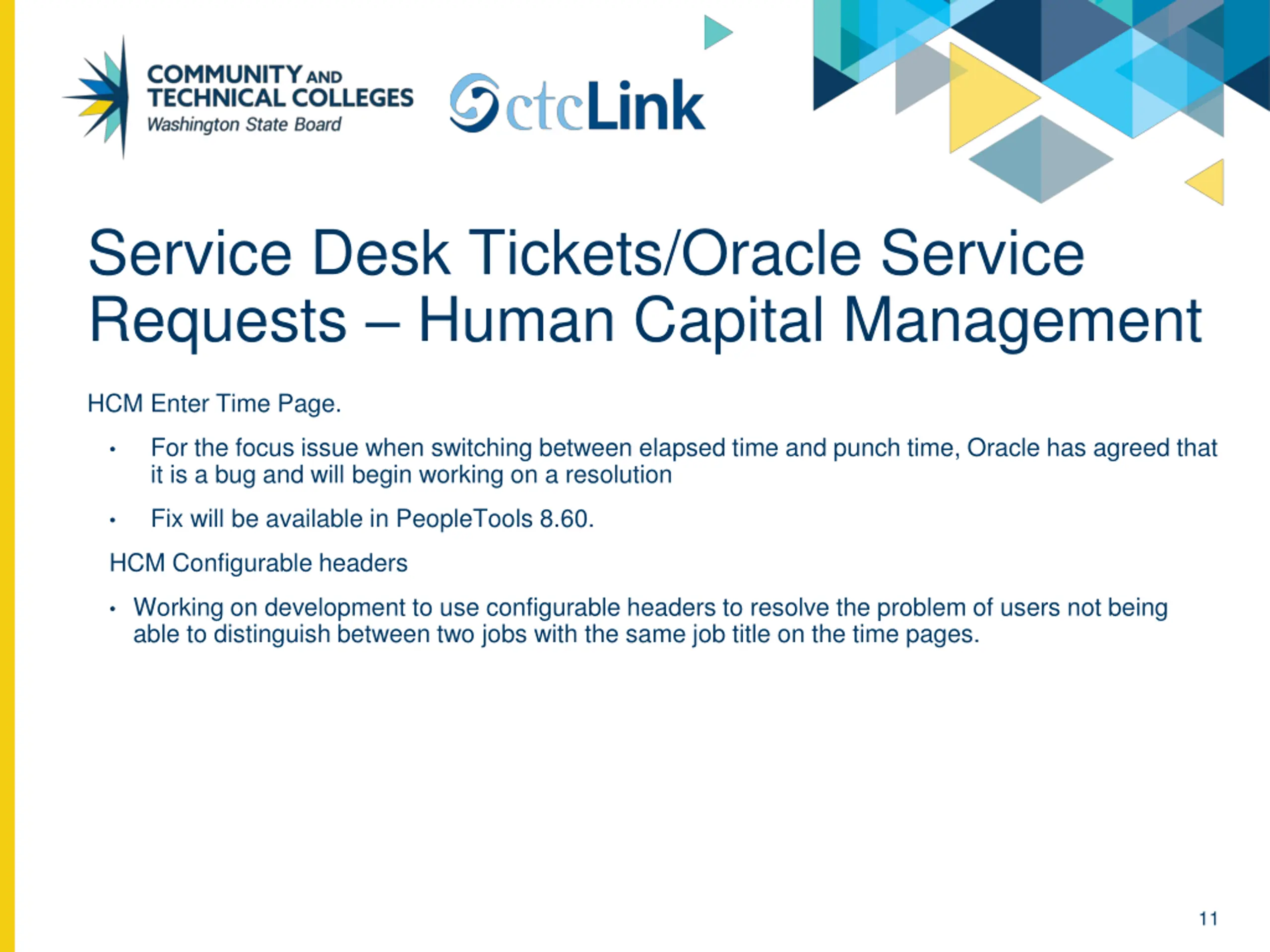 Service Desk Tickets/Oracle Service Requests Human Capital Management HCM Enter Time Page. For the focus issue when switching between elapsed time and punch time, Oracle has agreed that it is a bug and will begin working on a resolution Fix will be available in PeopleTools 8.60. HCM Configurable headers Working on development to use configurable headers to resolve the problem of users not being able to distinguish between two jobs with the same job title on the time pages. 11