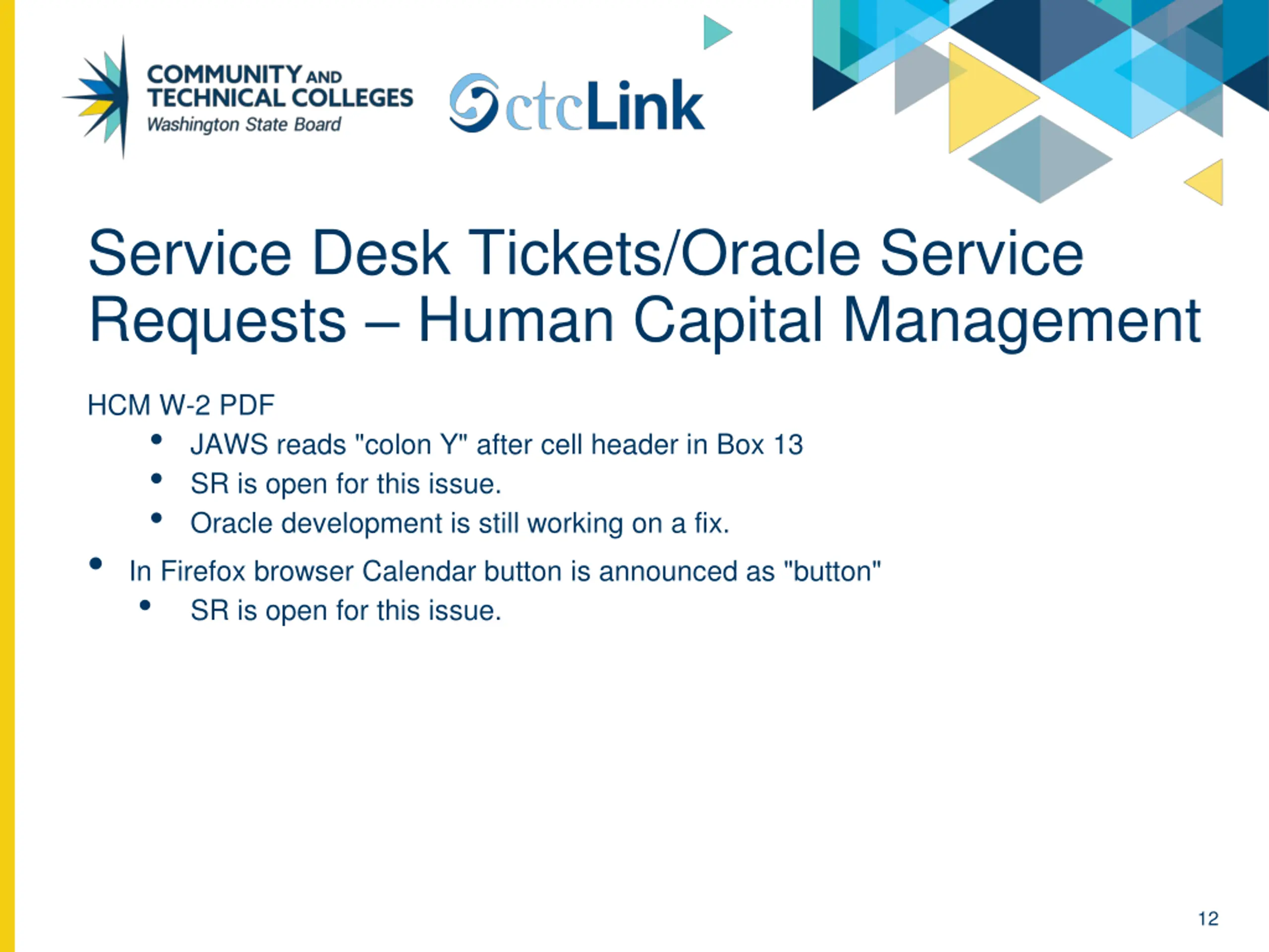 Service Desk Tickets/Oracle Service Requests Human Capital Management HCM W-2 PDF In Firefox browser Calendar button is announced as "button" SR is open for this issue. JAWS reads "colon Y" after cell header in Box 13 SR is open for this issue. Oracle development is still working on a fix. 12