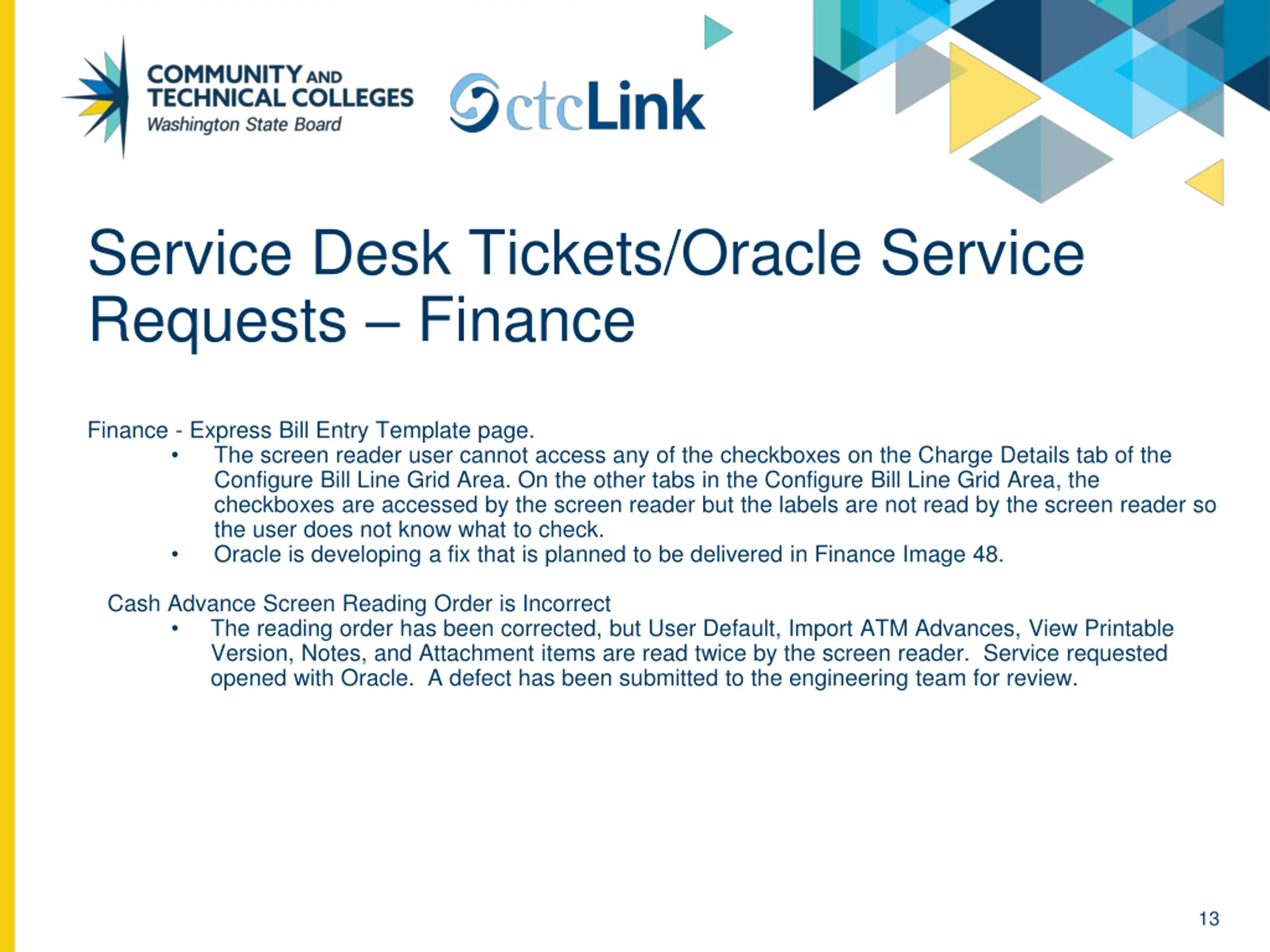 Service Desk Tickets/Oracle Service Requests Finance Finance - Express Bill Entry Template page. The screen reader user cannot access any of the checkboxes on the Charge Details tab of the Configure Bill Line Grid Area. On the other tabs in the Configure Bill Line Grid Area, the checkboxes are accessed by the screen reader but the labels are not read by the screen reader so the user does not know what to check. Oracle is developing a fix that is planned to be delivered in Finance Image 48. Cash Advance Screen Reading Order is Incorrect The reading order has been corrected, but User Default, Import ATM Advances, View Printable Version, Notes, and Attachment items are read twice by the screen reader. Service requested opened with Oracle. A defect has been submitted to the engineering team for review. 13