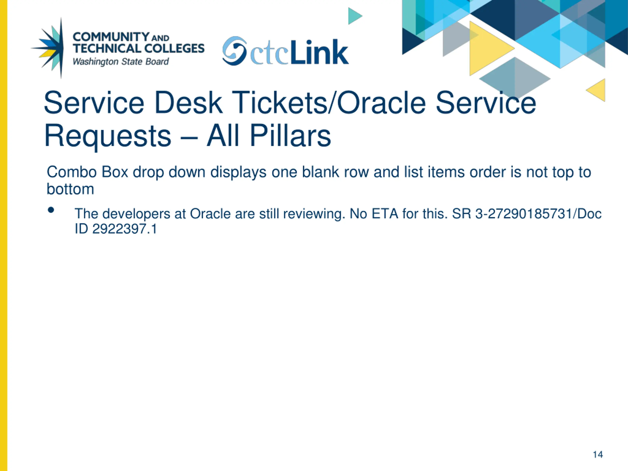 Service Desk Tickets/Oracle Service Requests All Pillars Combo Box drop down displays one blank row and list items order is not top to bottom The developers at Oracle are still reviewing. No ETA for this. SR 3-27290185731/Doc ID 2922397.1 14