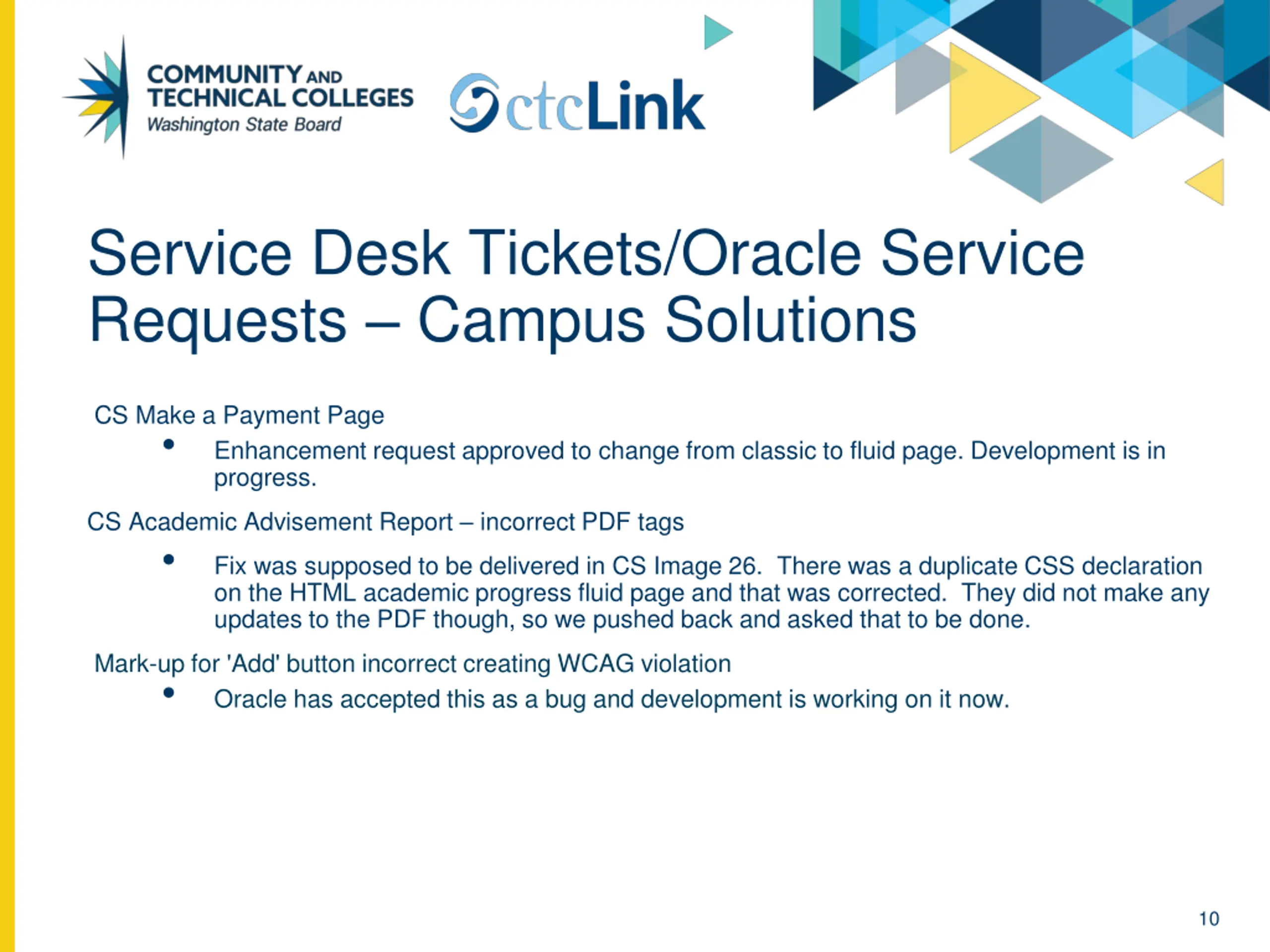 Service Desk Tickets/Oracle Service Requests Campus Solutions CS Make a Payment Page Enhancement request approved to change from classic to fluid page. Development is in progress. CS Academic Advisement Report incorrect PDF tags Fix was supposed to be delivered in CS Image 26. There was a duplicate CSS declaration on the HTML academic progress fluid page and that was corrected. They did not make any updates to the PDF though, so we pushed back and asked that to be done. Mark-up for 'Add' button incorrect creating WCAG violation Oracle has accepted this as a bug and development is working on it now. 10