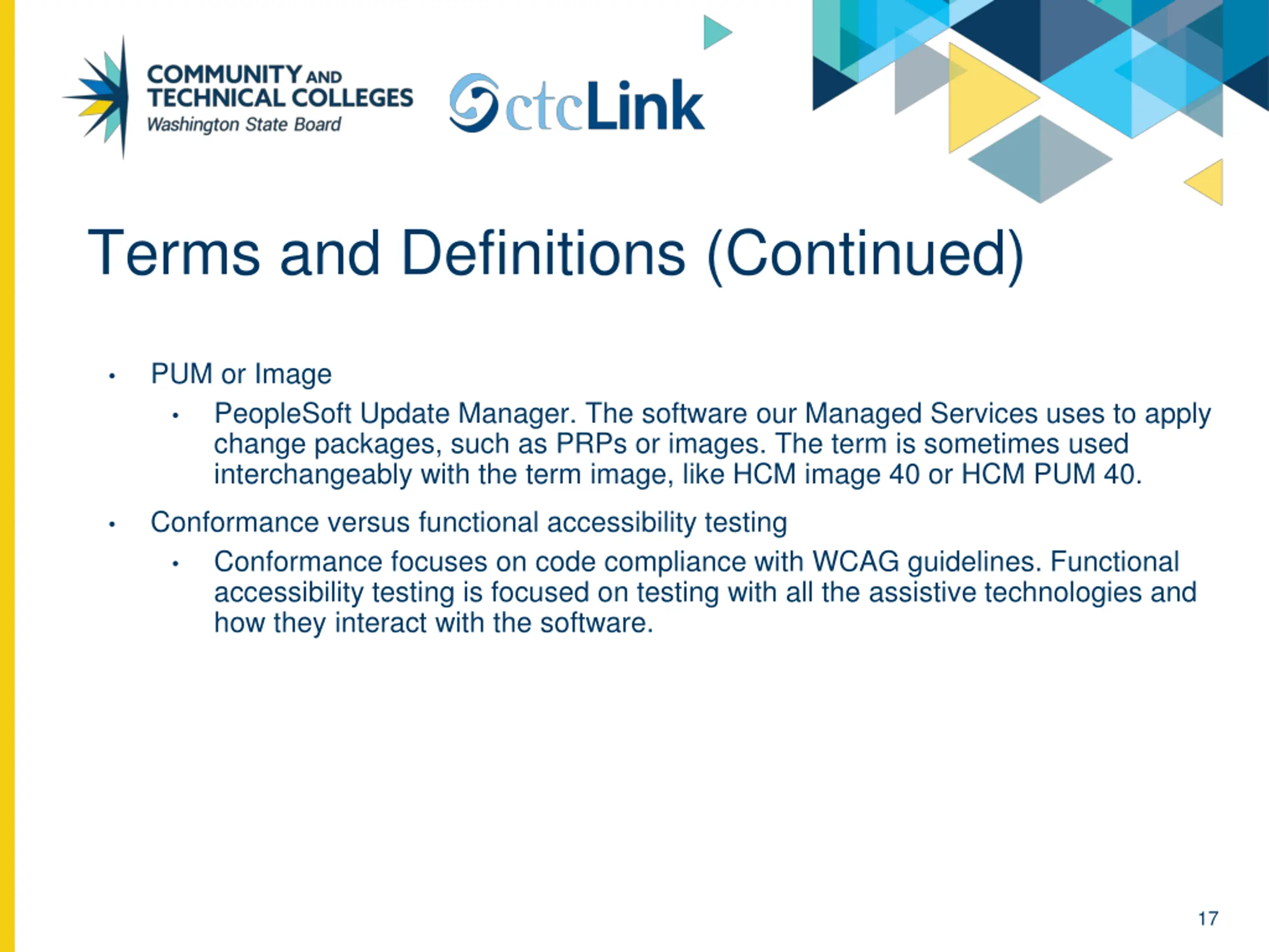 Terms and Definitions (Continued) PUM or Image PeopleSoft Update Manager. The software our Managed Services uses to apply change packages, such as PRPs or images. The term is sometimes used interchangeably with the term image, like HCM image 40 or HCM PUM 40. Conformance versus functional accessibility testing Conformance focuses on code compliance with WCAG guidelines. Functional accessibility testing is focused on testing with all the assistive technologies and how they interact with the software. 17