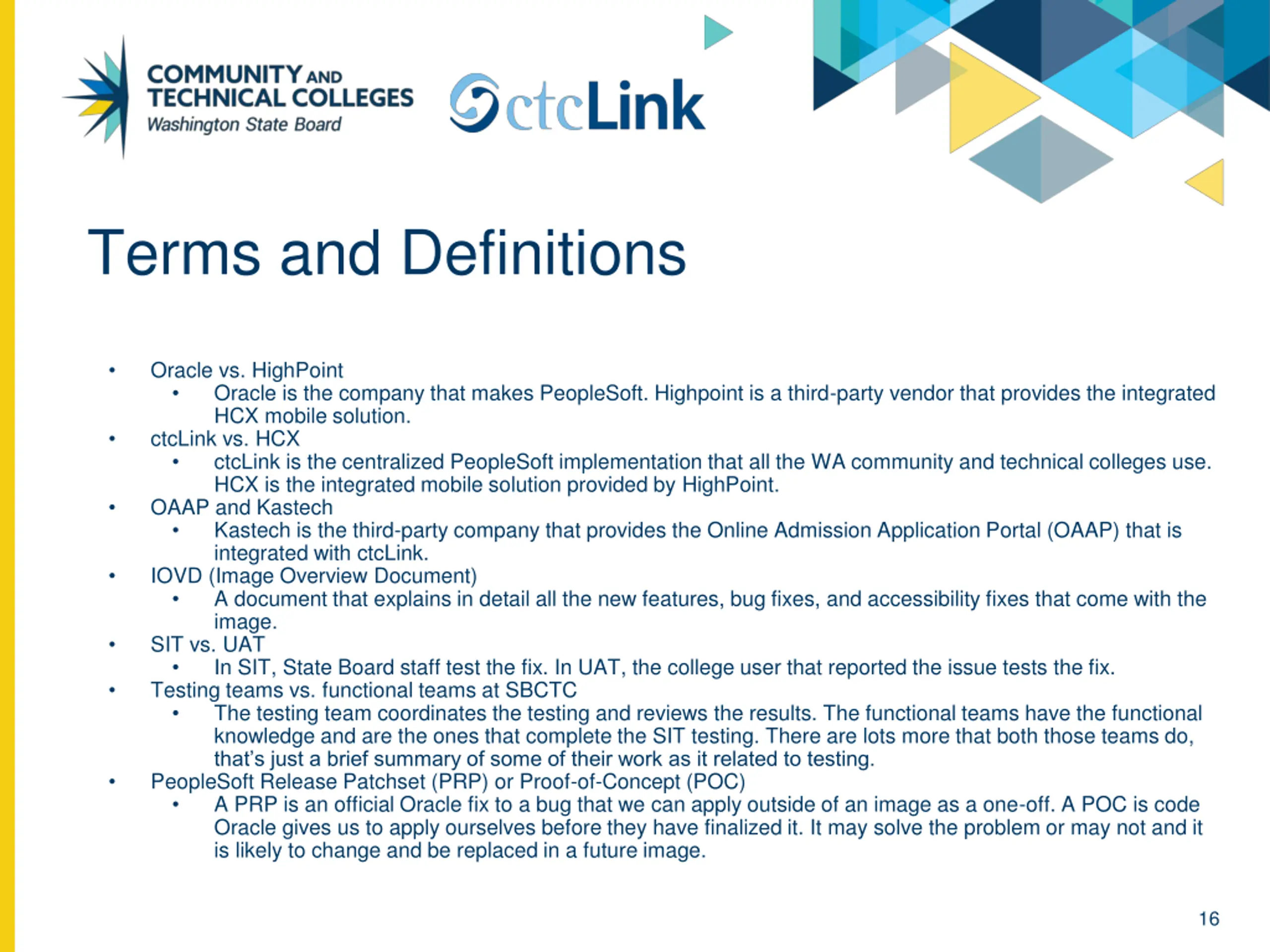 Terms and Definitions Oracle vs. HighPoint Oracle is the company that makes PeopleSoft. Highpoint is a third-party vendor that provides the integrated HCX mobile solution. ctcLink vs. HCX ctcLink is the centralized PeopleSoft implementation that all the WA community and technical colleges use. HCX is the integrated mobile solution provided by HighPoint. OAAP and Kastech Kastech is the third-party company that provides the Online Admission Application Portal (OAAP) that is integrated with ctcLink. IOVD (Image Overview Document) A document that explains in detail all the new features, bug fixes, and accessibility fixes that come with the image. SIT vs. UAT In SIT, State Board staff test the fix. In UAT, the college user that reported the issue tests the fix. Testing teams vs. functional teams at SBCTC The testing team coordinates the testing and reviews the results. The functional teams have the functional knowledge and are the ones that complete the SIT testing. There are lots more that both those teams do, that s just a brief summary of some of their work as it related to testing. PeopleSoft Release Patchset (PRP) or Proof-of-Concept (POC) A PRP is an official Oracle fix to a bug that we can apply outside of an image as a one-off. A POC is code Oracle gives us to apply ourselves before they have finalized it. It may solve the problem or may not and it is likely to change and be replaced in a future image. 16