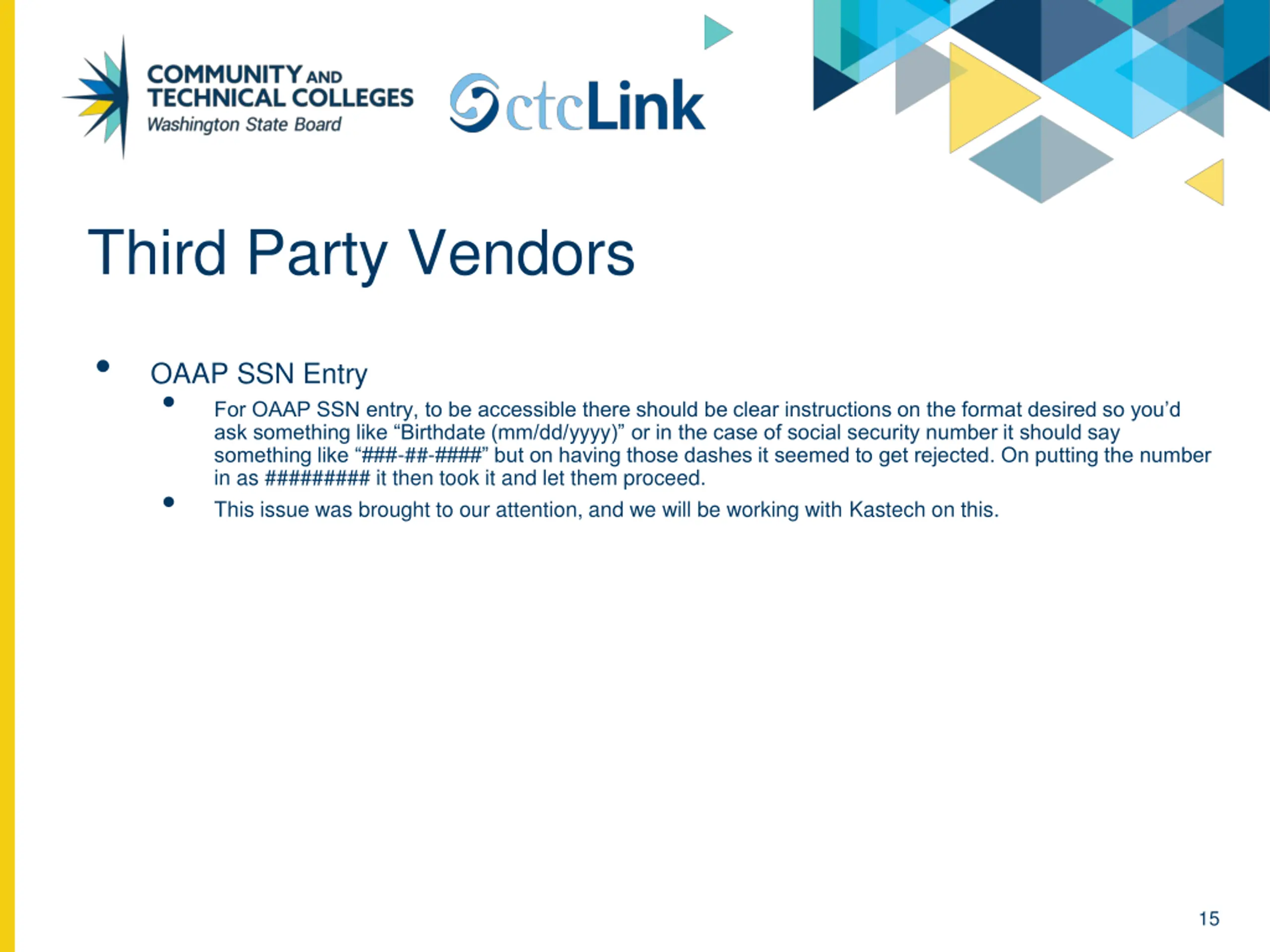 Third Party Vendors OAAP SSN Entry For OAAP SSN entry, to be accessible there should be clear instructions on the format desired so you d ask something like Birthdate (mm/dd/yyyy) or in the case of social security number it should say something like ###-##-#### but on having those dashes it seemed to get rejected. On putting the number in as ######### it then took it and let them proceed. This issue was brought to our attention, and we will be working with Kastech on this. 15