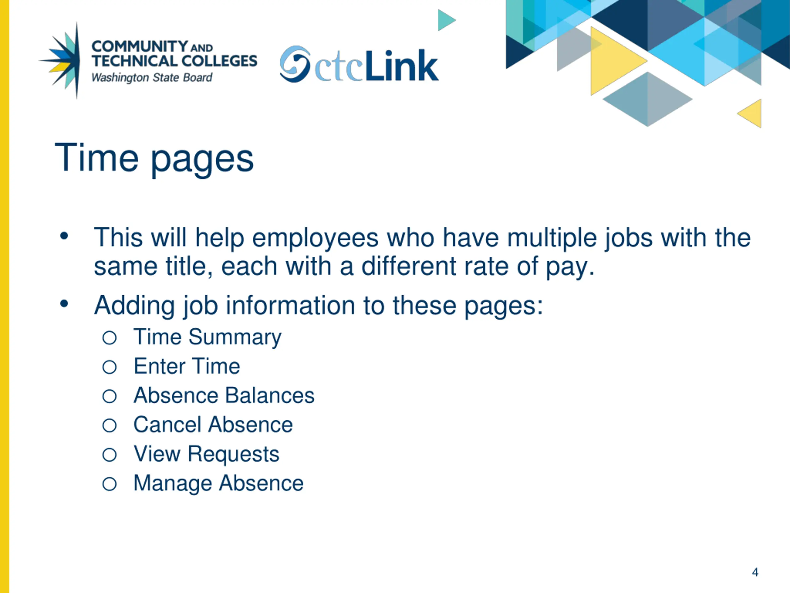Time pages This will help employees who have multiple jobs with the same title, each with a different rate of pay. Adding job information to these pages: o Time Summary o Enter Time o Absence Balances o Cancel Absence o View Requests o Manage Absence 4