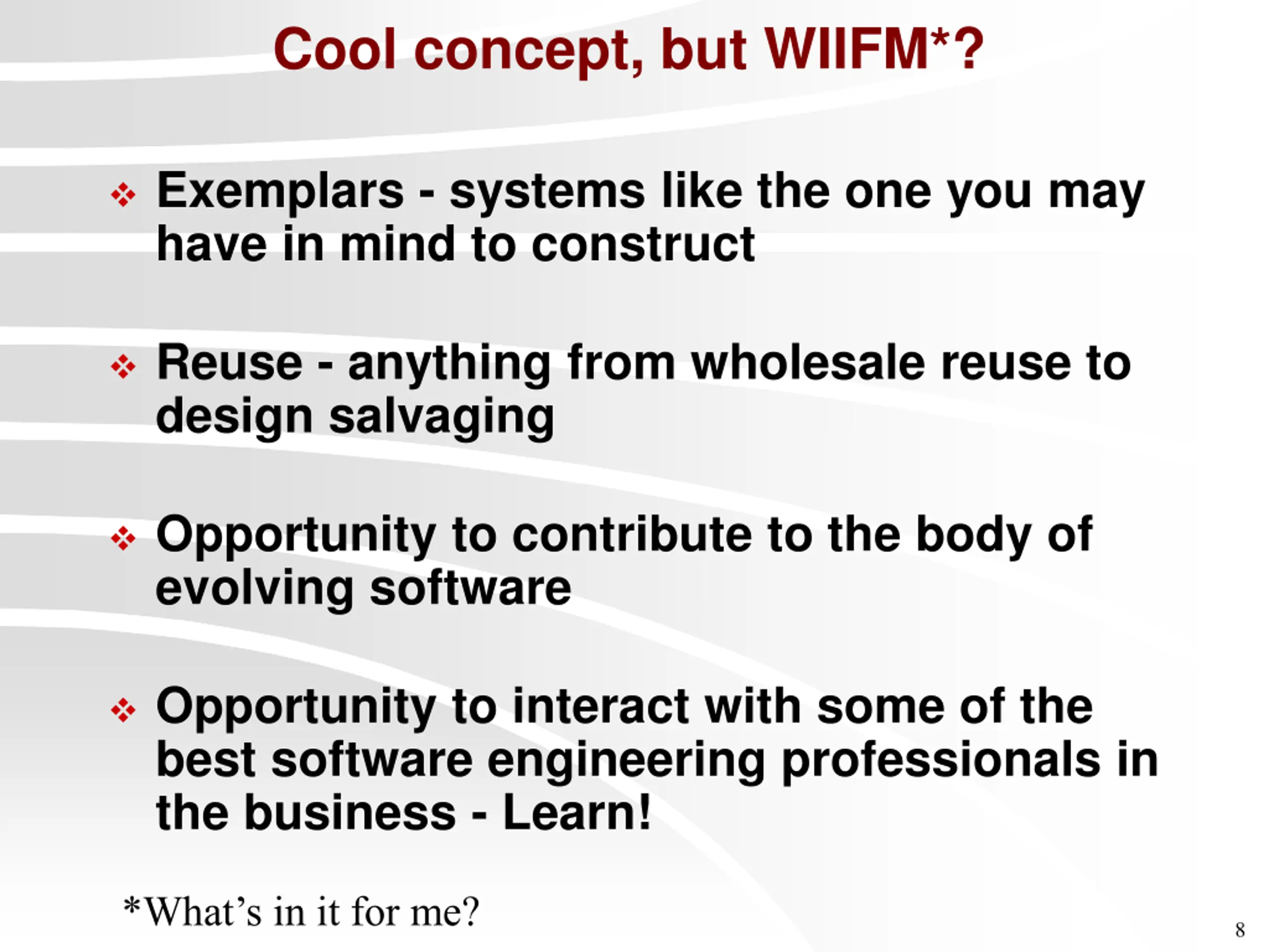 Cool concept, but WIIFM*? Exemplars - systems like the one you may have in mind to construct Reuse - anything from wholesale reuse to design salvaging Opportunity to contribute to the body of evolving software Opportunity to interact with some of the best software engineering professionals in the business - Learn! *What s in it for me? 8