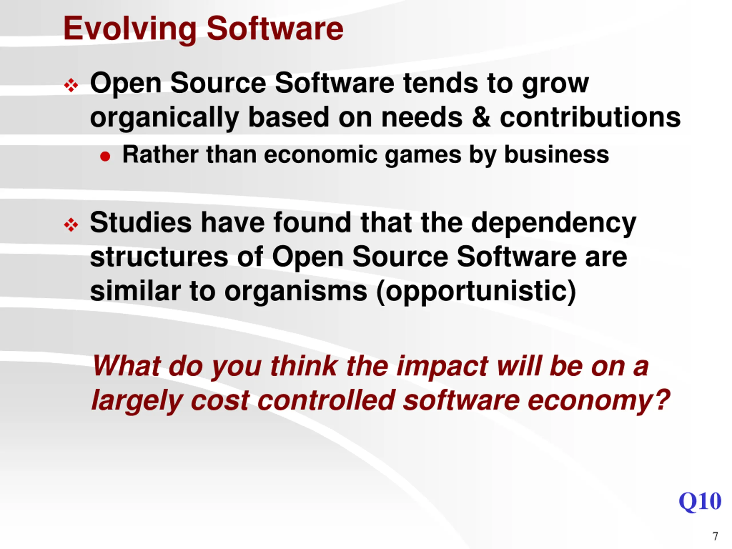 Evolving Software Open Source Software tends to grow organically based on needs & contributions Rather than economic games by business Studies have found that the dependency structures of Open Source Software are similar to organisms (opportunistic) What do you think the impact will be on a largely cost controlled software economy? Q10 7