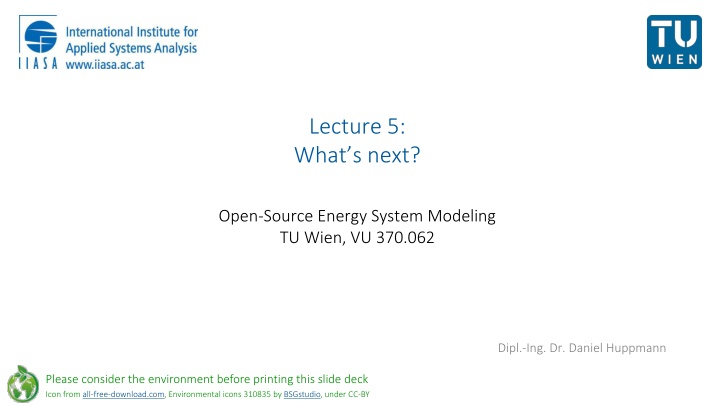 Lecture 5: What s next? Open-Source Energy System Modeling TU Wien, VU 370.062 Dipl.-Ing. Dr. Daniel Huppmann Please consider the environment before printing this slide deck Icon from all-free-download.com, Environmental icons 310835 by BSGstudio, under CC-BY all-free-download.com BSGstudio