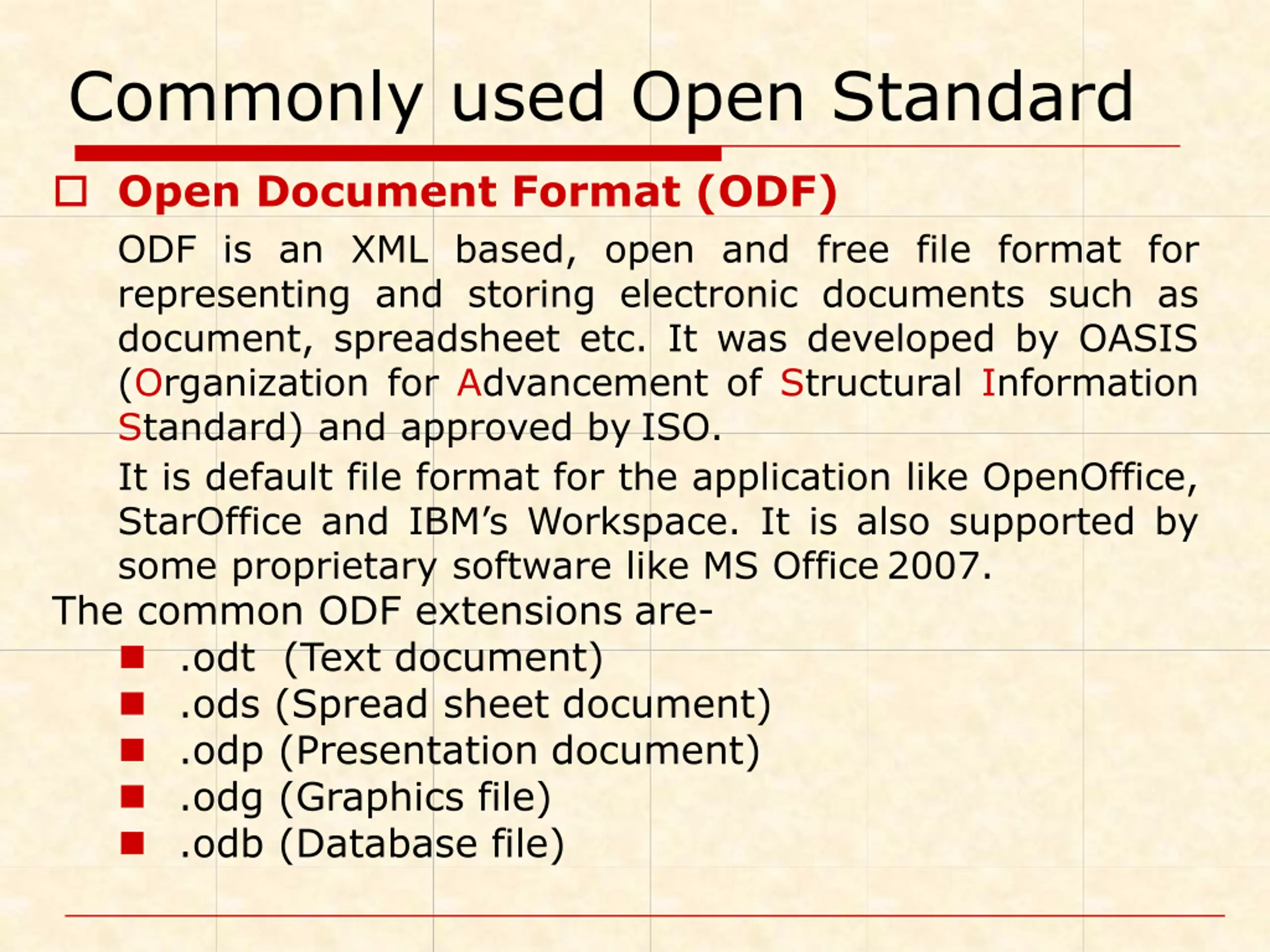 Commonly used Open Standard Open Document Format (ODF) ODF is an XML based, open and free file format for representing and storing electronic documents such as document, spreadsheet etc. It was developed by OASIS (Organization for Advancement of Structural Information Standard) and approved by ISO. It is default file format for the application like OpenOffice, StarOffice and IBM s Workspace. It is also supported by some proprietary software like MS Office2007. The common ODF extensions are- .odt (Text document) .ods (Spread sheet document) .odp (Presentation document) .odg (Graphics file) .odb (Database file)