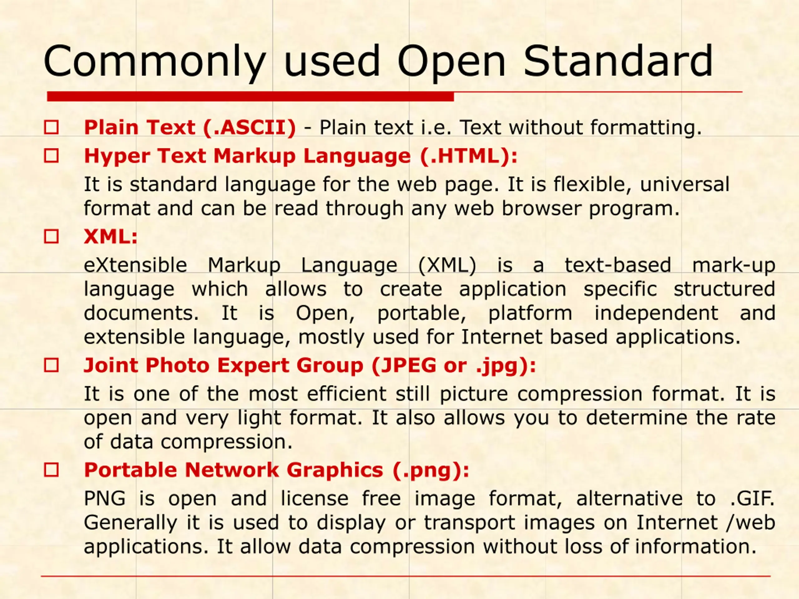 Commonly used Open Standard Plain Text (.ASCII) - Plain text i.e. Text without formatting. Hyper Text Markup Language (.HTML): It is standard language for the web page. It is flexible, universal format and can be read through any web browser program. XML: eXtensible Markup Language language which allows to create application specific structured documents. It is Open, portable, extensible language, mostly used for Internet based applications. Joint Photo Expert Group (JPEG or .jpg): It is one of the most efficient still picture compression format. It is open and very light format. It also allows you to determine the rate of data compression. Portable Network Graphics (.png): PNG is open and license free image format, alternative to .GIF. Generally it is used to display or transport images on Internet /web applications. It allow data compression without loss of information. (XML) is a text-based mark-up platform independent and