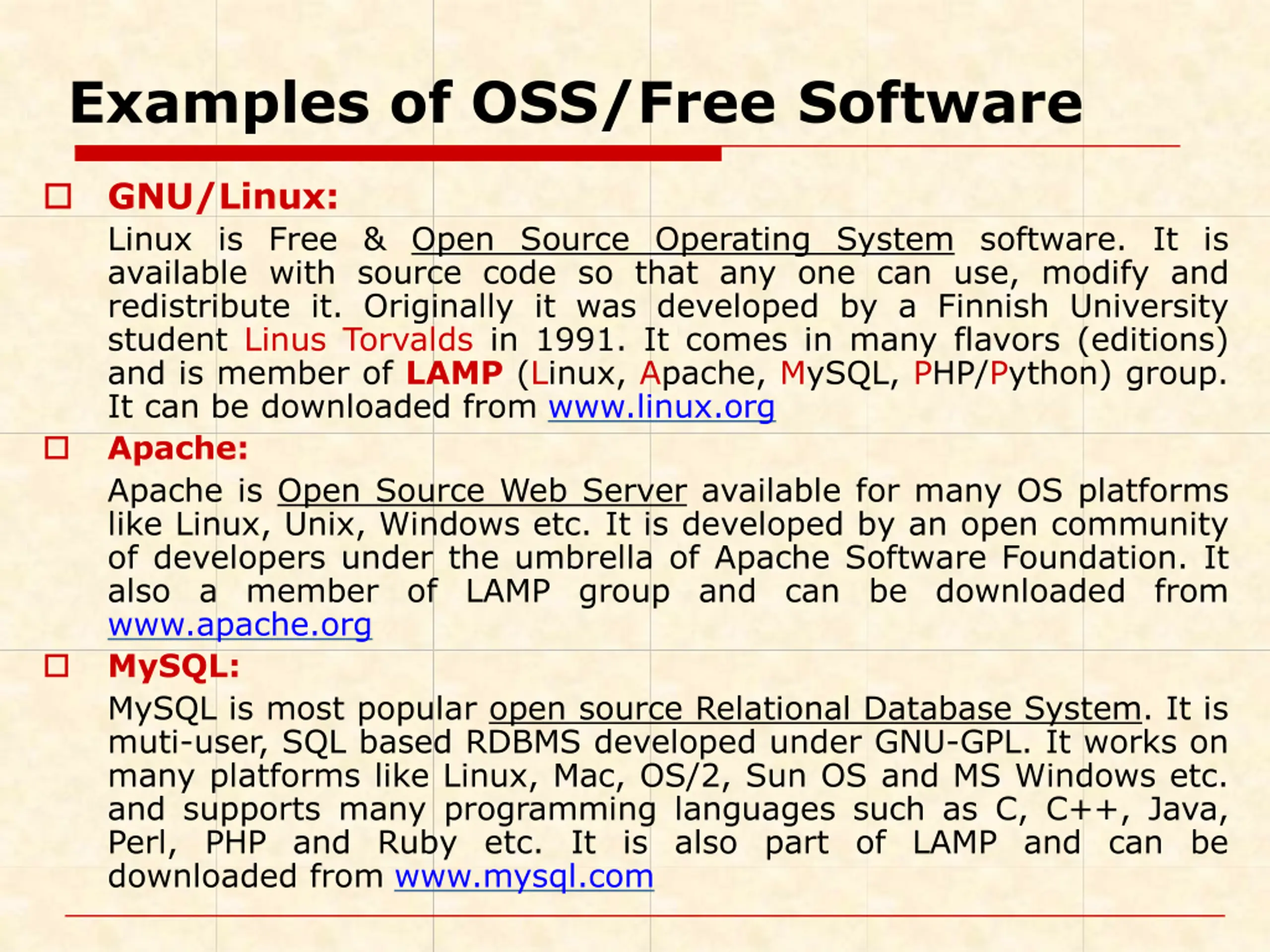 Examples of OSS/Free Software GNU/Linux: Linux is Free & Open Source Operating System software. It is available with source code so that any one can use, modify and redistribute it. Originally it was developed by a Finnish University student Linus Torvalds in 1991. It comes in many flavors (editions) and is member of LAMP (Linux, Apache, MySQL, PHP/Python) group. It can be downloaded from www.linux.org Apache: Apache is Open Source Web Server available for many OS platforms like Linux, Unix, Windows etc. It is developed by an open community of developers under the umbrella of Apache Software Foundation. It also a member of LAMP group and can be downloaded from www.apache.org MySQL: MySQL is most popular open source Relational Database System. It is muti-user, SQL based RDBMS developed under GNU-GPL. It works on many platforms like Linux, Mac, OS/2, Sun OS and MS Windows etc. and supports many programming languages such as C, C++, Java, Perl, PHP and Ruby etc. It is also part of LAMP and can be downloaded from www.mysql.com