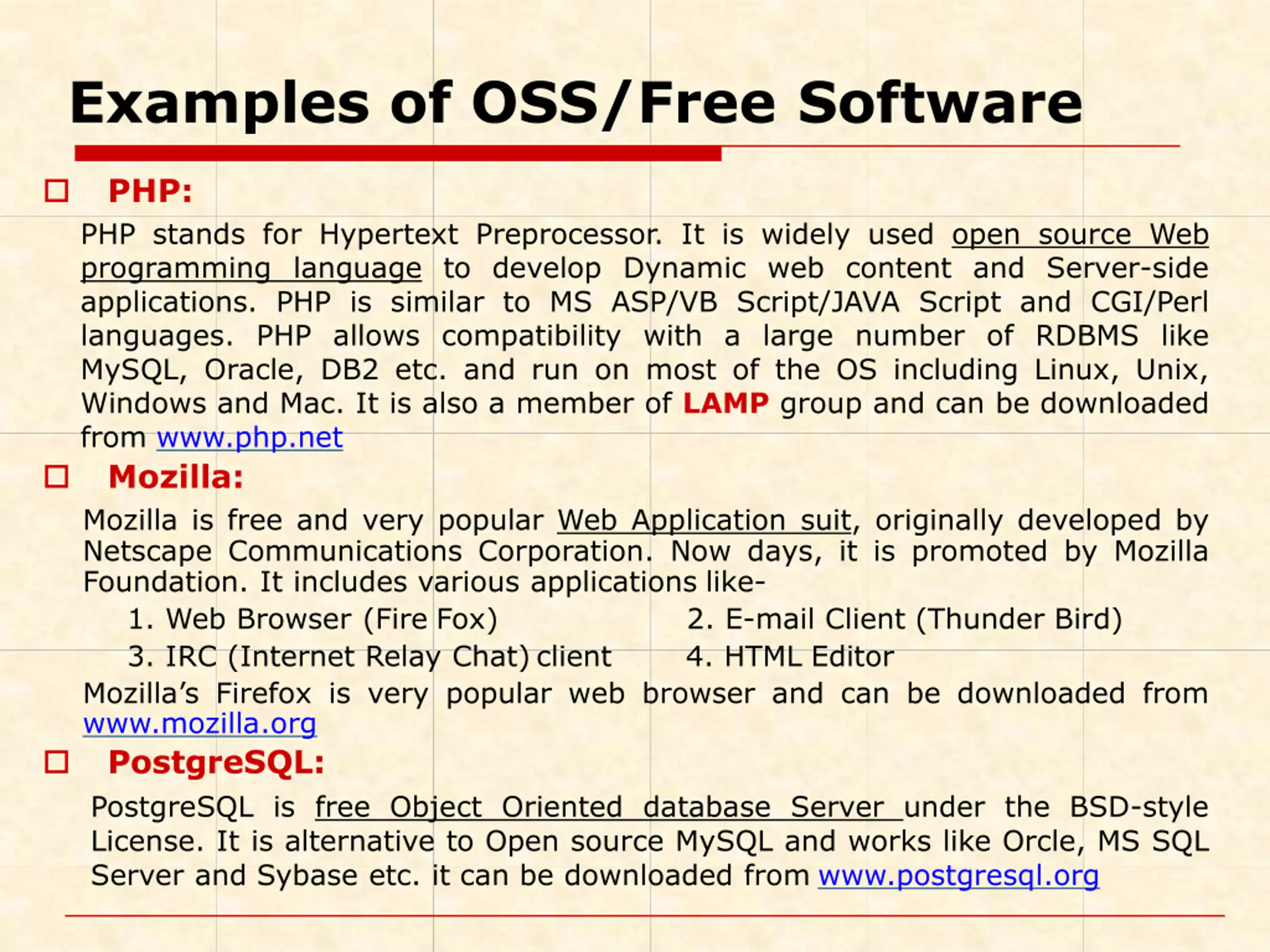 Examples of OSS/Free Software PHP: PHP stands for Hypertext Preprocessor. It is widely used open source Web programming language to develop Dynamic web content and Server-side applications. PHP is similar to MS ASP/VB Script/JAVA Script and CGI/Perl languages. PHP allows compatibility with a large number of RDBMS like MySQL, Oracle, DB2 etc. and run on most of the OS including Linux, Unix, Windows and Mac. It is also a member of LAMP group and can be downloaded from www.php.net Mozilla: Mozilla is free and very popular Web Application suit, originally developed by Netscape Communications Corporation. Now days, it is promoted by Mozilla Foundation. It includes various applications like- 1. Web Browser (Fire Fox) 3. IRC (Internet Relay Chat) client Mozilla s Firefox is very popular web browser and can be downloaded from www.mozilla.org PostgreSQL: PostgreSQL is free Object Oriented database Server under the BSD-style License. It is alternative to Open source MySQL and works like Orcle, MS SQL Server and Sybase etc. it can be downloaded from www.postgresql.org 2. E-mail Client (Thunder Bird) 4. HTML Editor