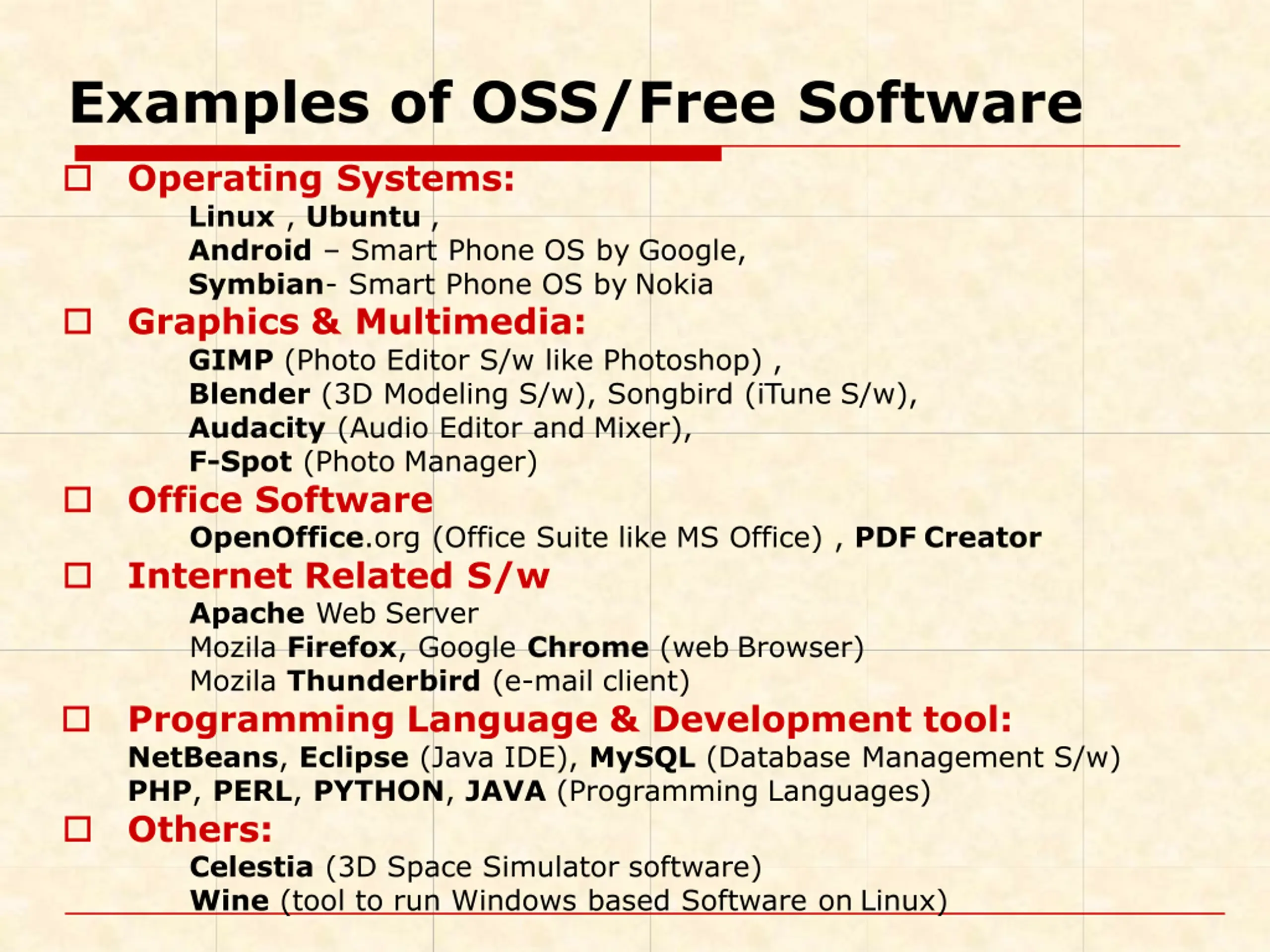Examples of OSS/Free Software Operating Systems: Linux , Ubuntu , Android Smart Phone OS by Google, Symbian- Smart Phone OS by Nokia Graphics & Multimedia: GIMP (Photo Editor S/w like Photoshop) , Blender (3D Modeling S/w), Songbird (iTune S/w), Audacity (Audio Editor and Mixer), F-Spot (Photo Manager) Office Software OpenOffice.org (Office Suite like MS Office) , PDF Creator Internet Related S/w Apache Web Server Mozila Firefox, Google Chrome (web Browser) Mozila Thunderbird (e-mail client) Programming Language & Development tool: NetBeans, Eclipse (Java IDE), MySQL (Database Management S/w) PHP, PERL, PYTHON, JAVA (Programming Languages) Others: Celestia (3D Space Simulator software) Wine (tool to run Windows based Software on Linux)