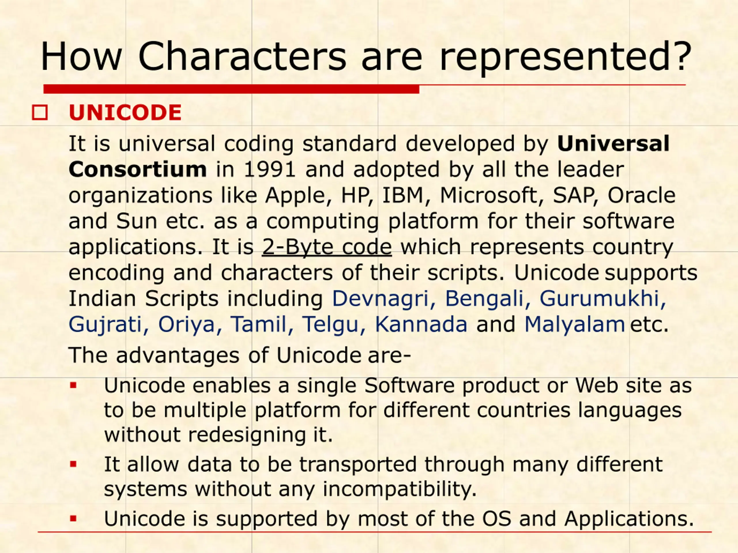 How Characters are represented? UNICODE It is universal coding standard developed by Universal Consortium in 1991 and adopted by all the leader organizations like Apple, HP, IBM, Microsoft, SAP, Oracle and Sun etc. as a computing platform for their software applications. It is 2-Byte code which represents country encoding and characters of their scripts. Unicode supports Indian Scripts including Devnagri, Bengali, Gurumukhi, Gujrati, Oriya, Tamil, Telgu, Kannada and Malyalametc. The advantages of Unicode are- Unicode enables a single Software product or Web site as to be multiple platform for different countries languages without redesigning it. It allow data to be transported through many different systems without any incompatibility. Unicode is supported by most of the OS and Applications.