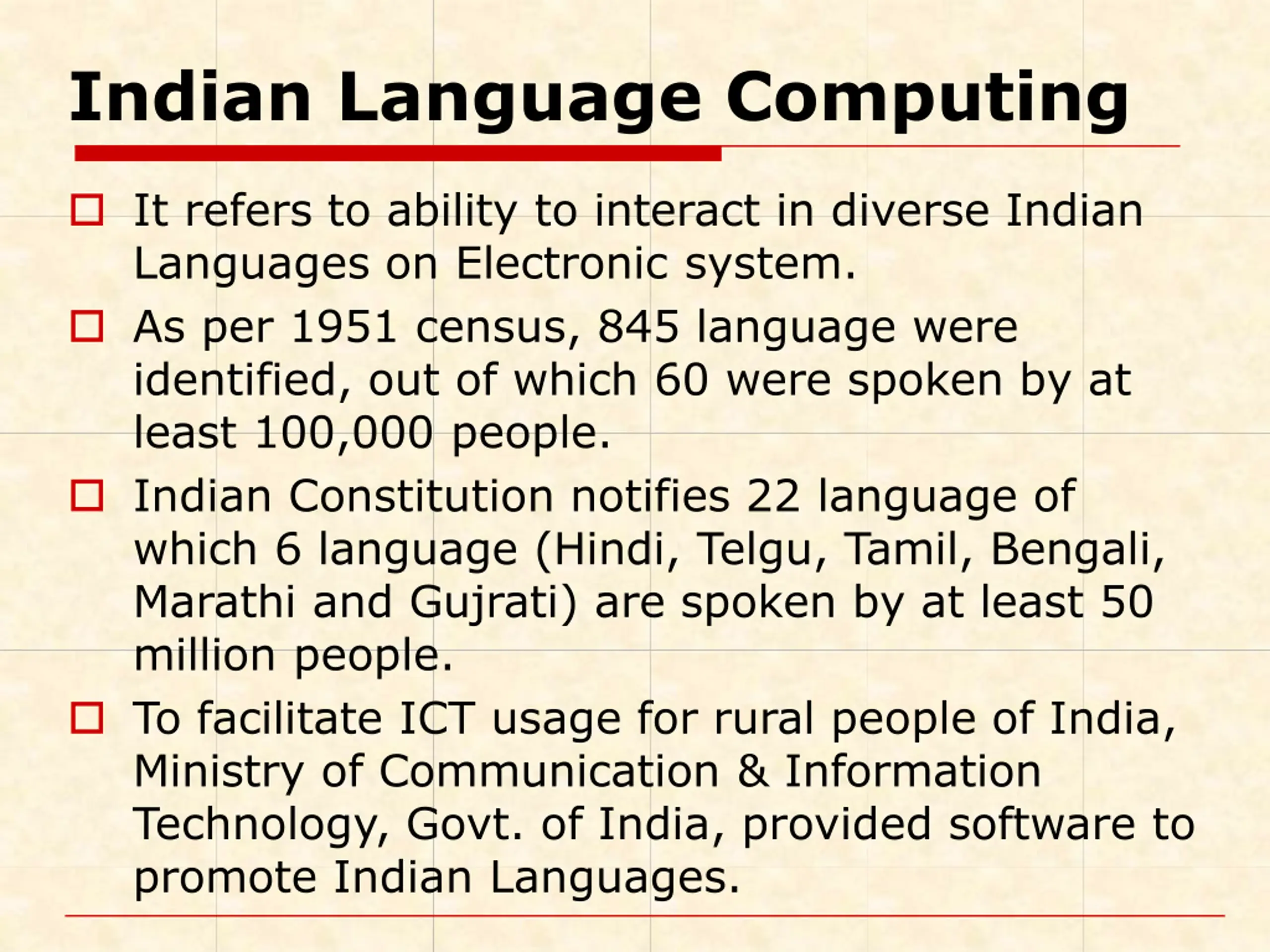 Indian Language Computing It refers to ability to interact in diverse Indian Languages on Electronic system. As per 1951 census, 845 language were identified, out of which 60 were spoken by at least 100,000 people. Indian Constitution notifies 22 language of which 6 language (Hindi, Telgu, Tamil, Bengali, Marathi and Gujrati) are spoken by at least 50 million people. To facilitate ICT usage for rural people of India, Ministry of Communication & Information Technology, Govt. of India, provided software to promote Indian Languages.