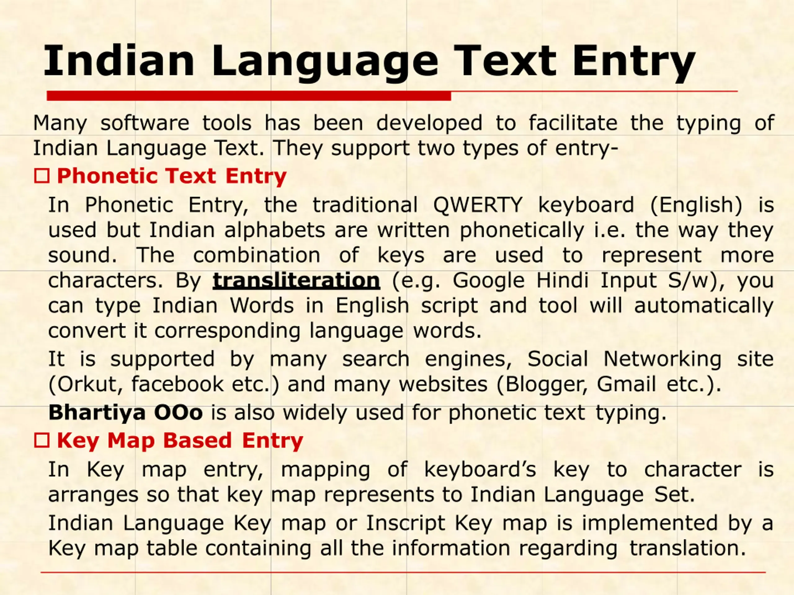 Indian Language Text Entry Many software tools has been developed to facilitate the typing of Indian Language Text. They support two types of entry- Phonetic Text Entry In Phonetic Entry, the traditional QWERTY keyboard (English) is used but Indian alphabets are written phonetically i.e. the way they sound. The combination of keys are used to represent more characters. By transliteration (e.g. Google Hindi Input S/w), you can type Indian Words in English script and tool will automatically convert it corresponding language words. It is supported by many search engines, Social Networking site (Orkut, facebook etc.) and many websites (Blogger, Gmail etc.). Bhartiya OOo is also widely used for phonetic text typing. Key Map Based Entry In Key map entry, mapping of keyboard s key to character is arranges so that key map represents to Indian Language Set. Indian Language Key map or Inscript Key map is implemented by a Key map table containing all the information regarding translation.