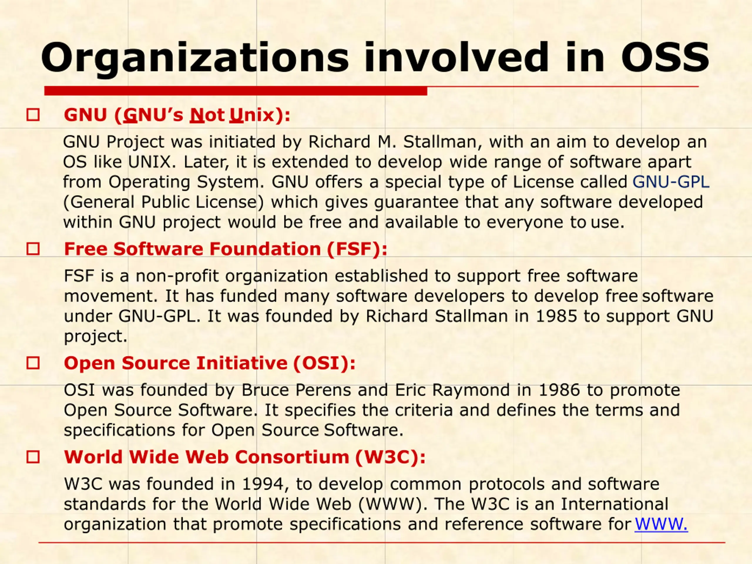 Organizations involved in OSS GNU (GNU s Not Unix): GNU Project was initiated by Richard M. Stallman, with an aim to develop an OS like UNIX. Later, it is extended to develop wide range of software apart from Operating System. GNU offers a special type of License called GNU-GPL (General Public License) which gives guarantee that any software developed within GNU project would be free and available to everyone to use. Free Software Foundation (FSF): FSF is a non-profit organization established to support free software movement. It has funded many software developers to develop free software under GNU-GPL. It was founded by Richard Stallman in 1985 to support GNU project. Open Source Initiative (OSI): OSI was founded by Bruce Perens and Eric Raymond in 1986 to promote Open Source Software. It specifies the criteria and defines the terms and specifications for Open Source Software. World Wide Web Consortium (W3C): W3C was founded in 1994, to develop common protocols and software standards for the World Wide Web (WWW). The W3C is an International organization that promote specifications and reference software forWWW.