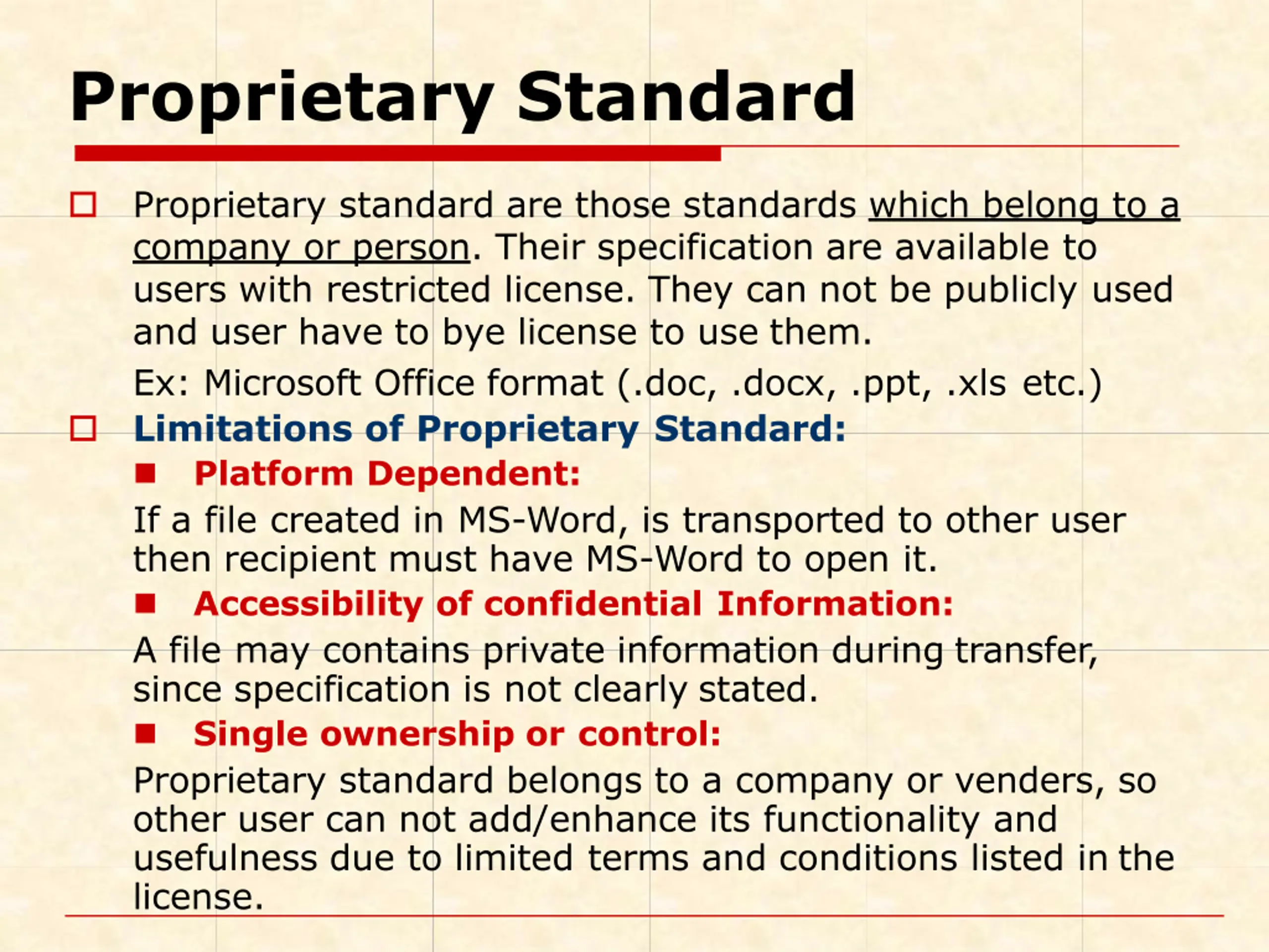 Proprietary Standard Proprietary standard are those standards which belong to a company or person. Their specification are available to users with restricted license. They can not be publicly used and user have to bye license to use them. Ex: Microsoft Office format (.doc, .docx, .ppt, .xls etc.) Limitations of Proprietary Standard: Platform Dependent: If a file created in MS-Word, is transported to other user then recipient must have MS-Word to open it. Accessibility of confidential Information: A file may contains private information during transfer, since specification is not clearly stated. Single ownership or control: Proprietary standard belongs to a company or venders, so other user can not add/enhance its functionality and usefulness due to limited terms and conditions listed in the license.