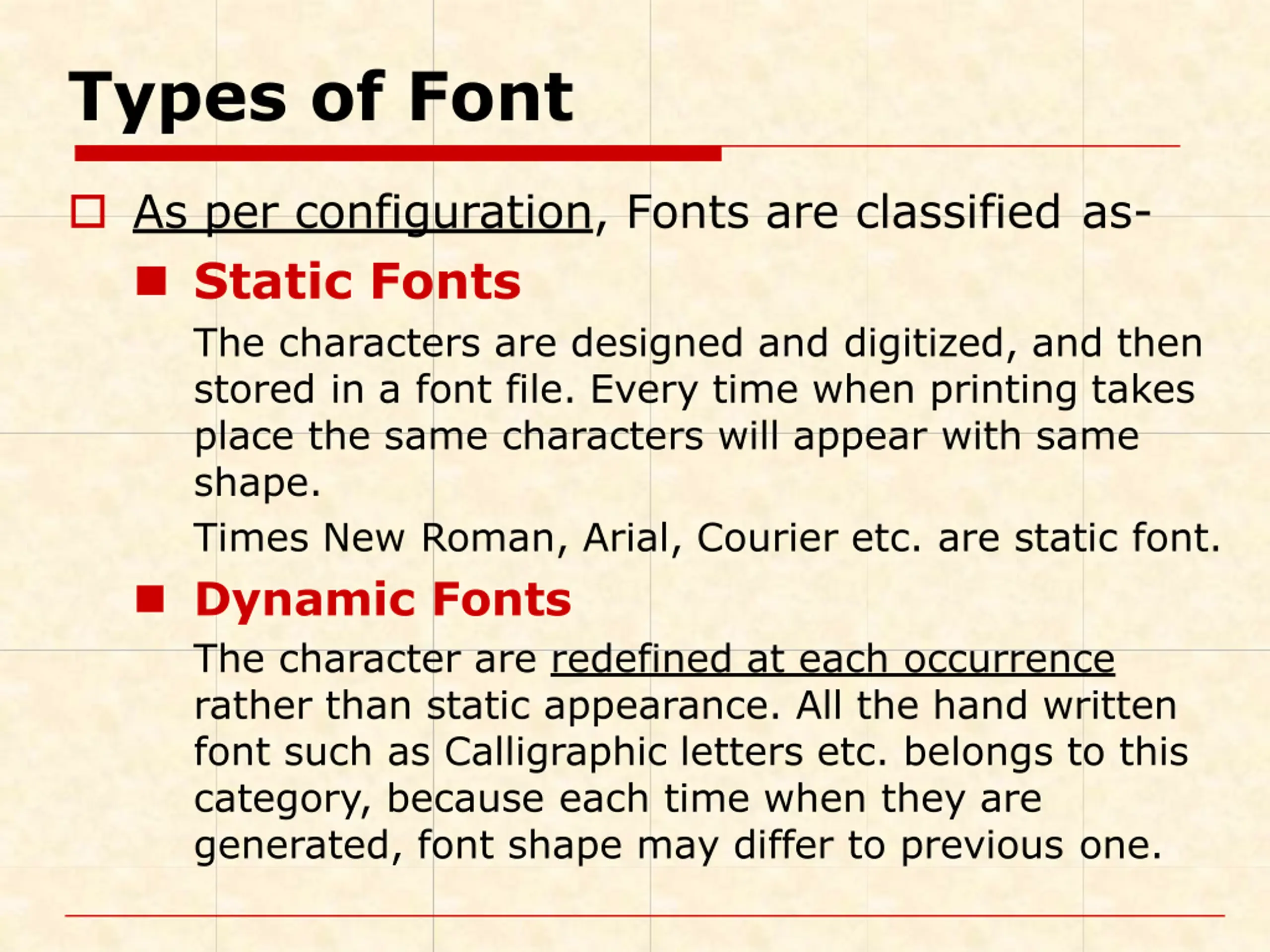 Types of Font As per configuration, Fonts are classified as- Static Fonts The characters are designed and digitized, and then stored in a font file. Every time when printing takes place the same characters will appear with same shape. Times New Roman, Arial, Courier etc. are static font. Dynamic Fonts The character are redefined at each occurrence rather than static appearance. All the hand written font such as Calligraphic letters etc. belongs to this category, because each time when they are generated, font shape may differ to previous one.