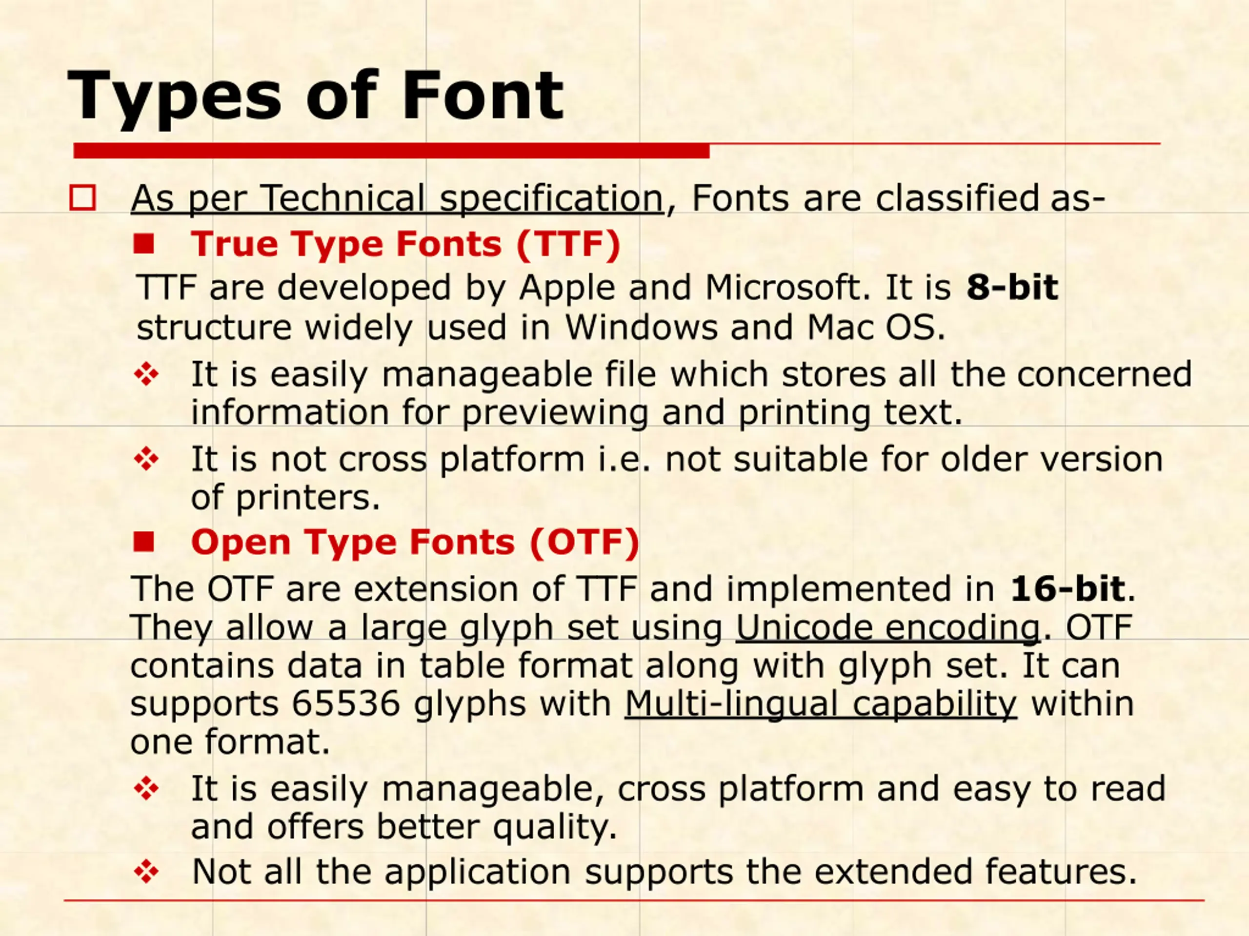 Types of Font As per Technical specification, Fonts are classified as- True Type Fonts (TTF) TTF are developed by Apple and Microsoft. It is 8-bit structure widely used in Windows and Mac OS. It is easily manageable file which stores all the concerned information for previewing and printing text. It is not cross platform i.e. not suitable for older version of printers. Open Type Fonts (OTF) The OTF are extension of TTF and implemented in 16-bit. They allow a large glyph set using Unicode encoding. OTF contains data in table format along with glyph set. It can supports 65536 glyphs with Multi-lingual capability within one format. It is easily manageable, cross platform and easy to read and offers better quality. Not all the application supports the extended features.