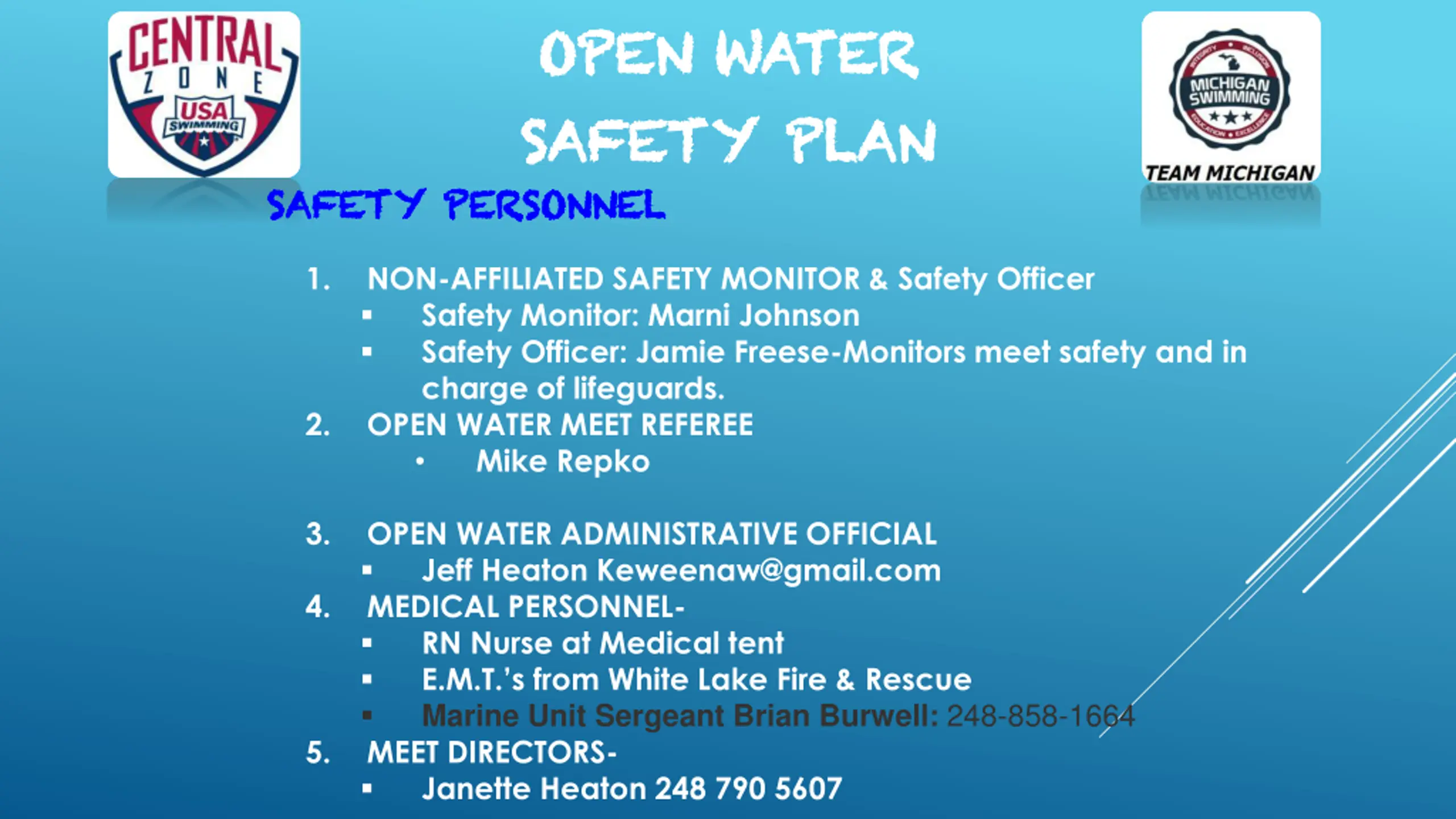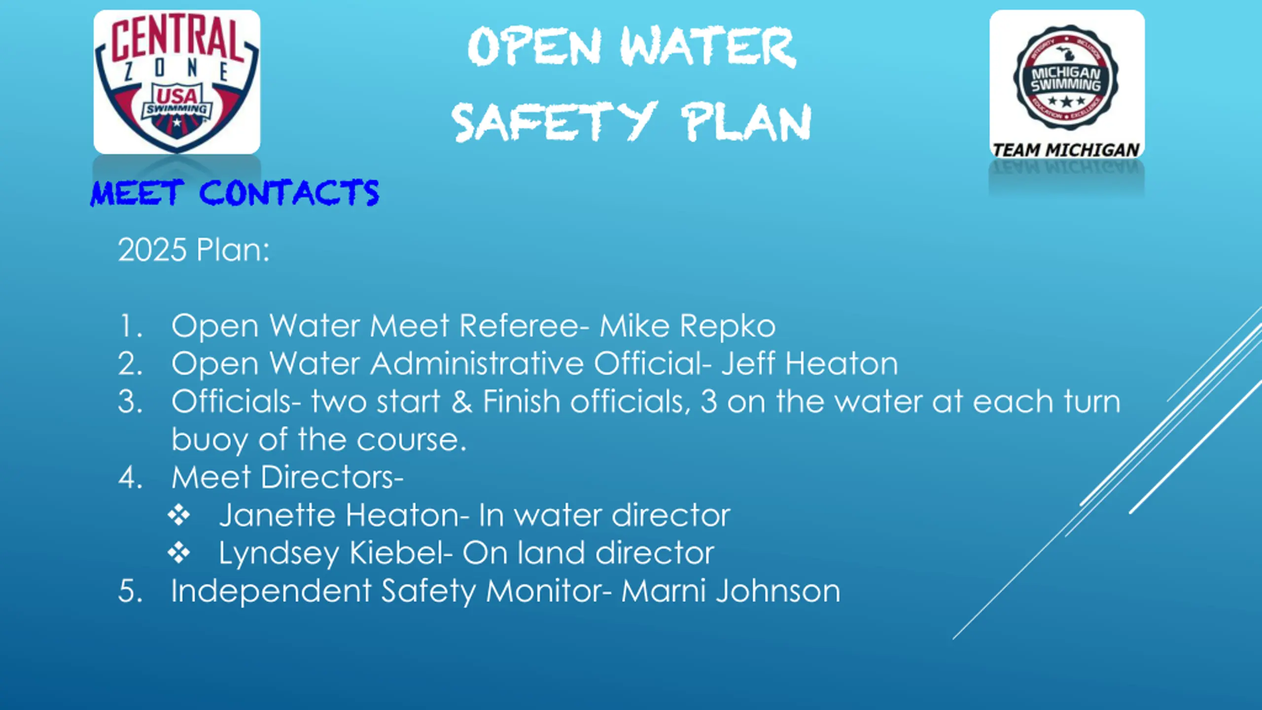 OPEN WATER OPEN WATER SAFETY PLAN SAFETY PLAN MEET CONTACTS MEET CONTACTS 2025 Plan: 1. Open Water Meet Referee- Mike Repko 2. Open Water Administrative Official- Jeff Heaton 3. Officials- two start & Finish officials, 3 on the water at each turn buoy of the course. 4. Meet Directors- Janette Heaton- In water director Lyndsey Kiebel- On land director 5. Independent Safety Monitor- Marni Johnson