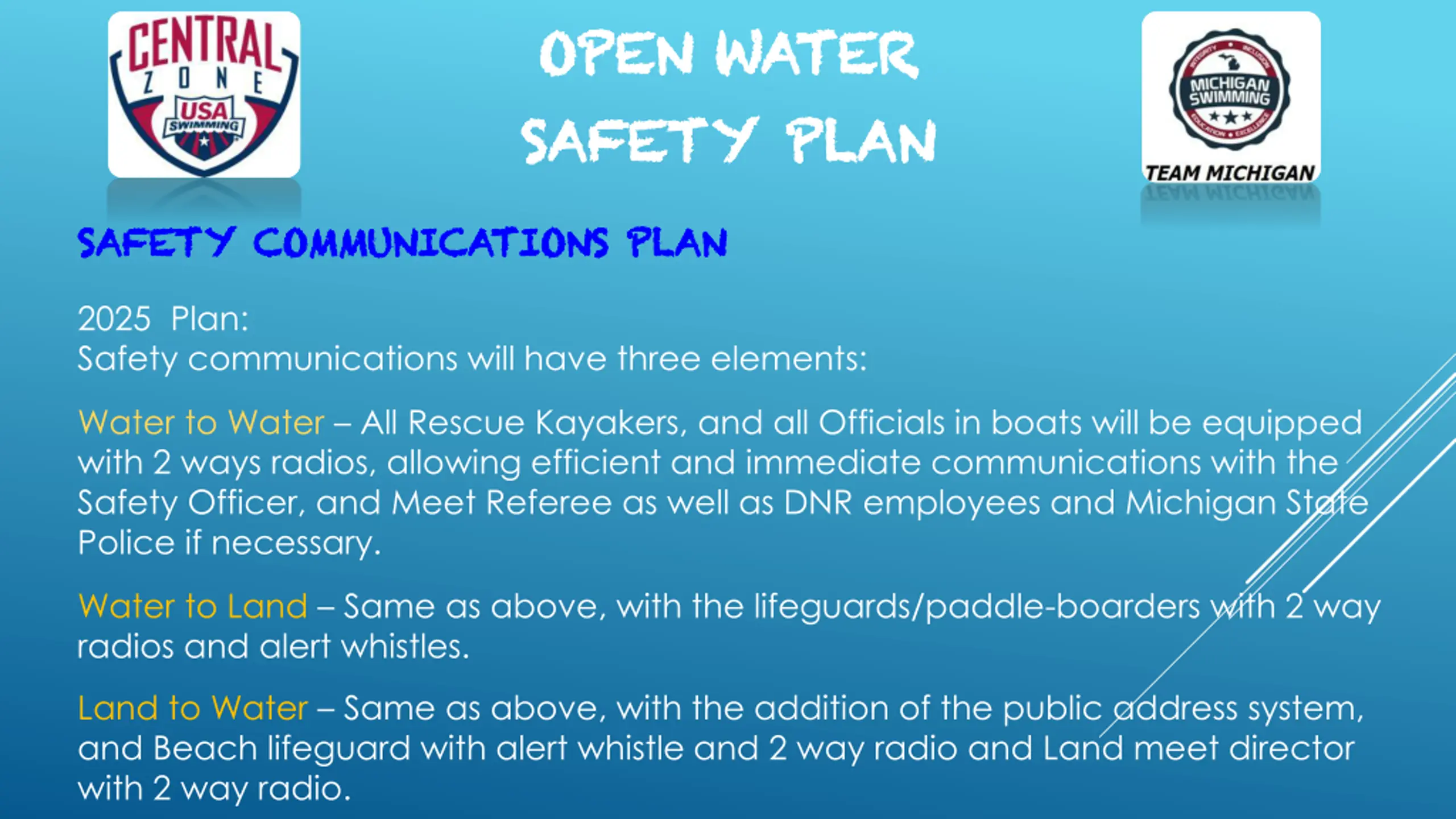 OPEN WATER OPEN WATER SAFETY PLAN SAFETY PLAN SAFETY COMMUNICATIONS PLAN SAFETY COMMUNICATIONS PLAN 2025 Plan: Safety communications will have three elements: Water to Water All Rescue Kayakers, and all Officials in boats will be equipped with 2 ways radios, allowing efficient and immediate communications with the Safety Officer, and Meet Referee as well as DNR employees and Michigan State Police if necessary. Water to Land Same as above, with the lifeguards/paddle-boarders with 2 way radios and alert whistles. Land to Water Same as above, with the addition of the public address system, and Beach lifeguard with alert whistle and 2 way radio and Land meet director with 2 way radio.