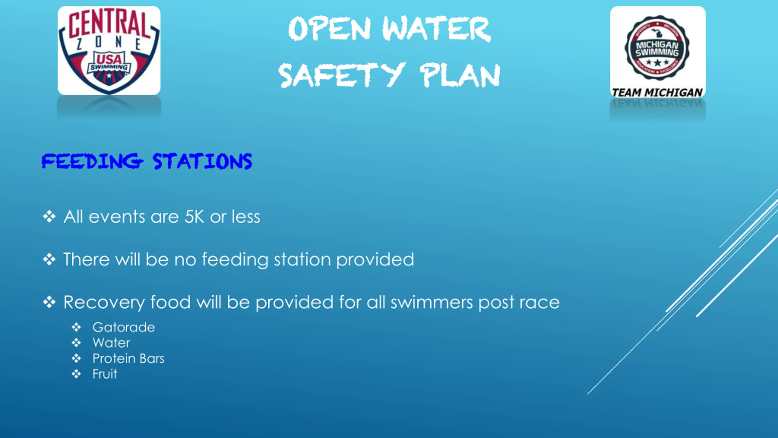 OPEN WATER OPEN WATER SAFETY PLAN SAFETY PLAN FEEDING STATIONS FEEDING STATIONS All events are 5K or less There will be no feeding station provided Recovery food will be provided for all swimmers post race Gatorade Water Protein Bars Fruit