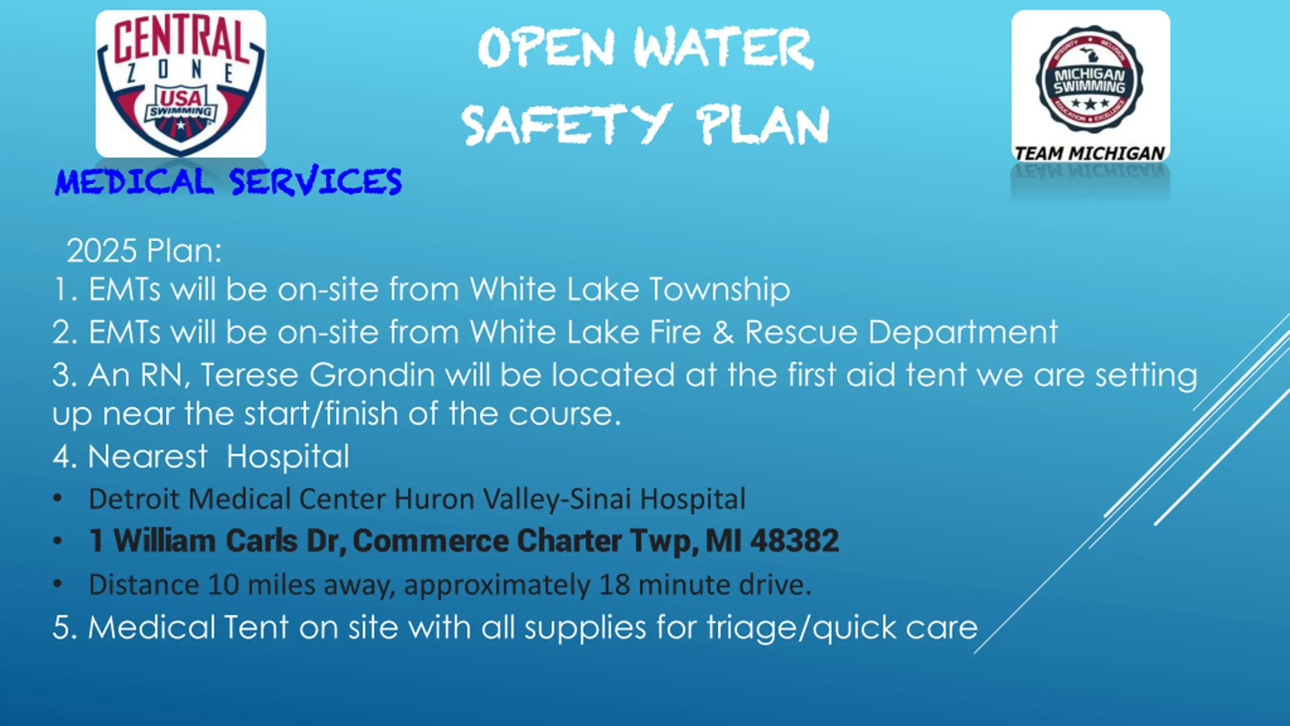 OPEN WATER OPEN WATER SAFETY PLAN SAFETY PLAN MEDICAL SERVICES MEDICAL SERVICES 2025 Plan: 1. EMTs will be on-site from White Lake Township 2. EMTs will be on-site from White Lake Fire & Rescue Department 3. An RN, Terese Grondin will be located at the first aid tent we are setting up near the start/finish of the course. 4. Nearest Hospital Detroit Medical Center Huron Valley-Sinai Hospital 1 William Carls Dr, Commerce Charter Twp, MI 48382 Distance 10 miles away, approximately 18 minute drive. 5. Medical Tent on site with all supplies for triage/quick care