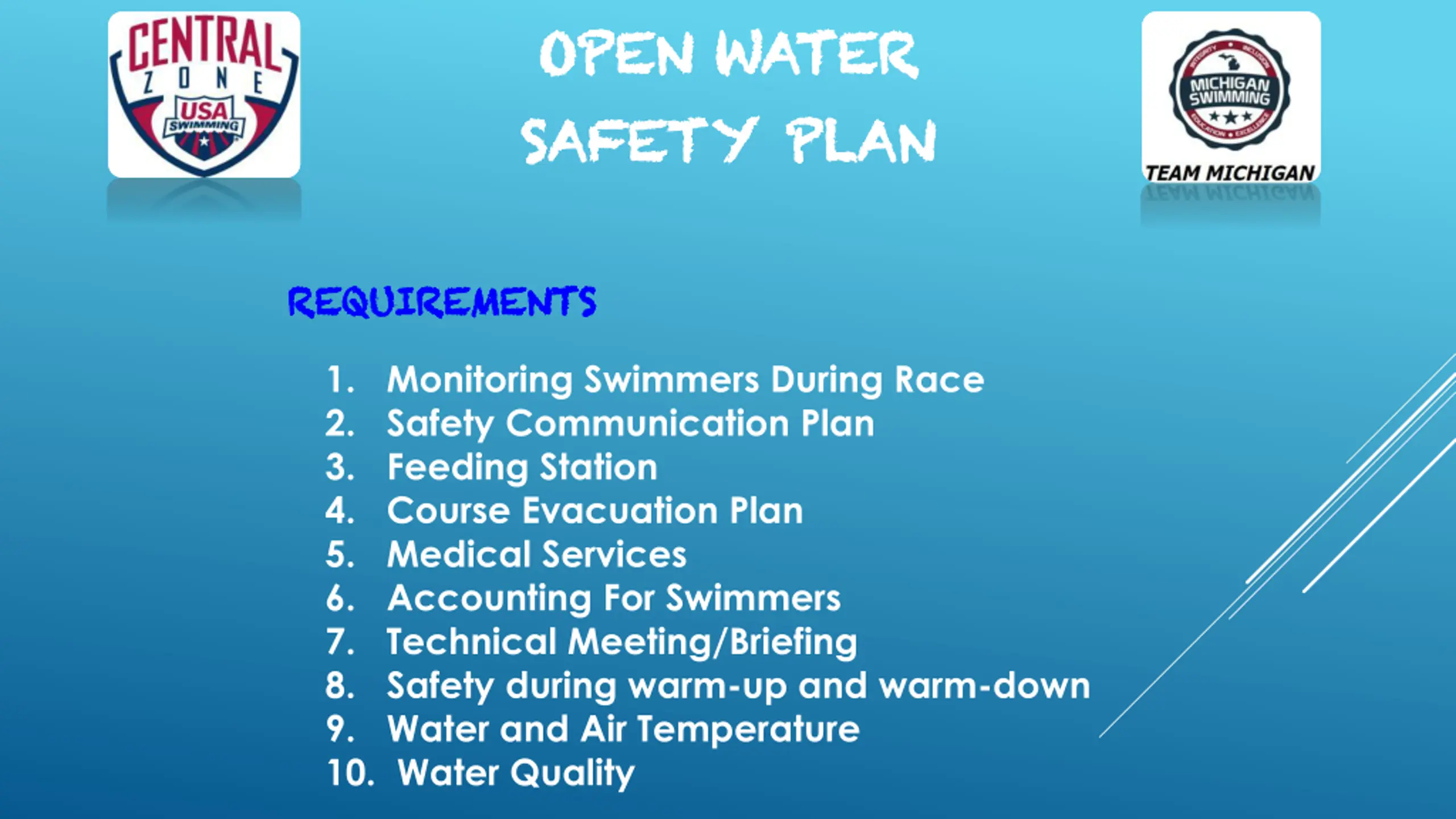 OPEN WATER OPEN WATER SAFETY PLAN SAFETY PLAN REQUIREMENTS REQUIREMENTS 1. Monitoring Swimmers During Race 2. Safety Communication Plan 3. Feeding Station 4. Course Evacuation Plan 5. Medical Services 6. Accounting For Swimmers 7. Technical Meeting/Briefing 8. Safety during warm-up and warm-down 9. Water and Air Temperature 10. Water Quality