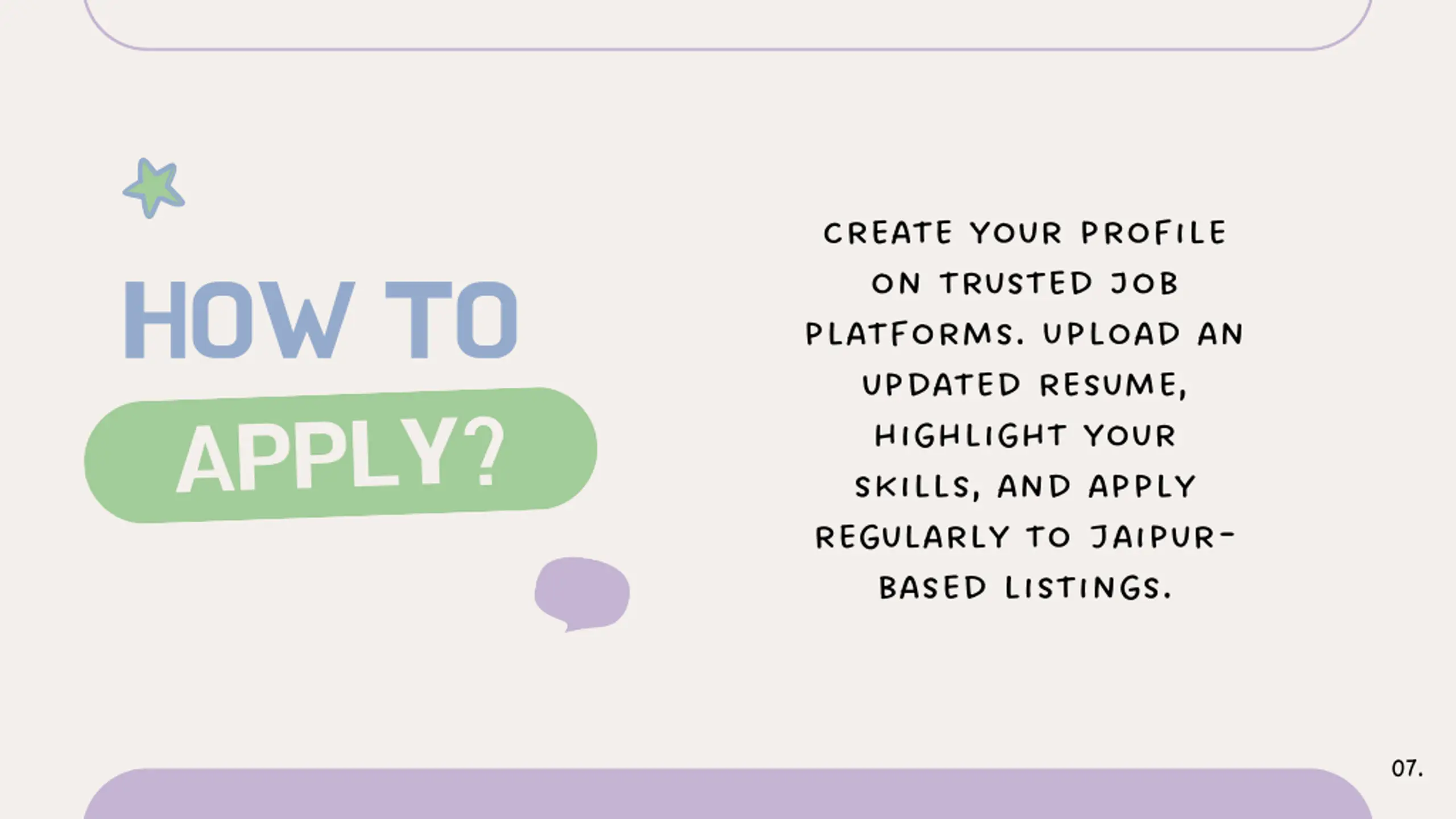 Create your profile on trusted job platforms. Upload an updated resume, highlight your skills, and apply regularly to Jaipur- based listings. HOWTO APPLY? 07.