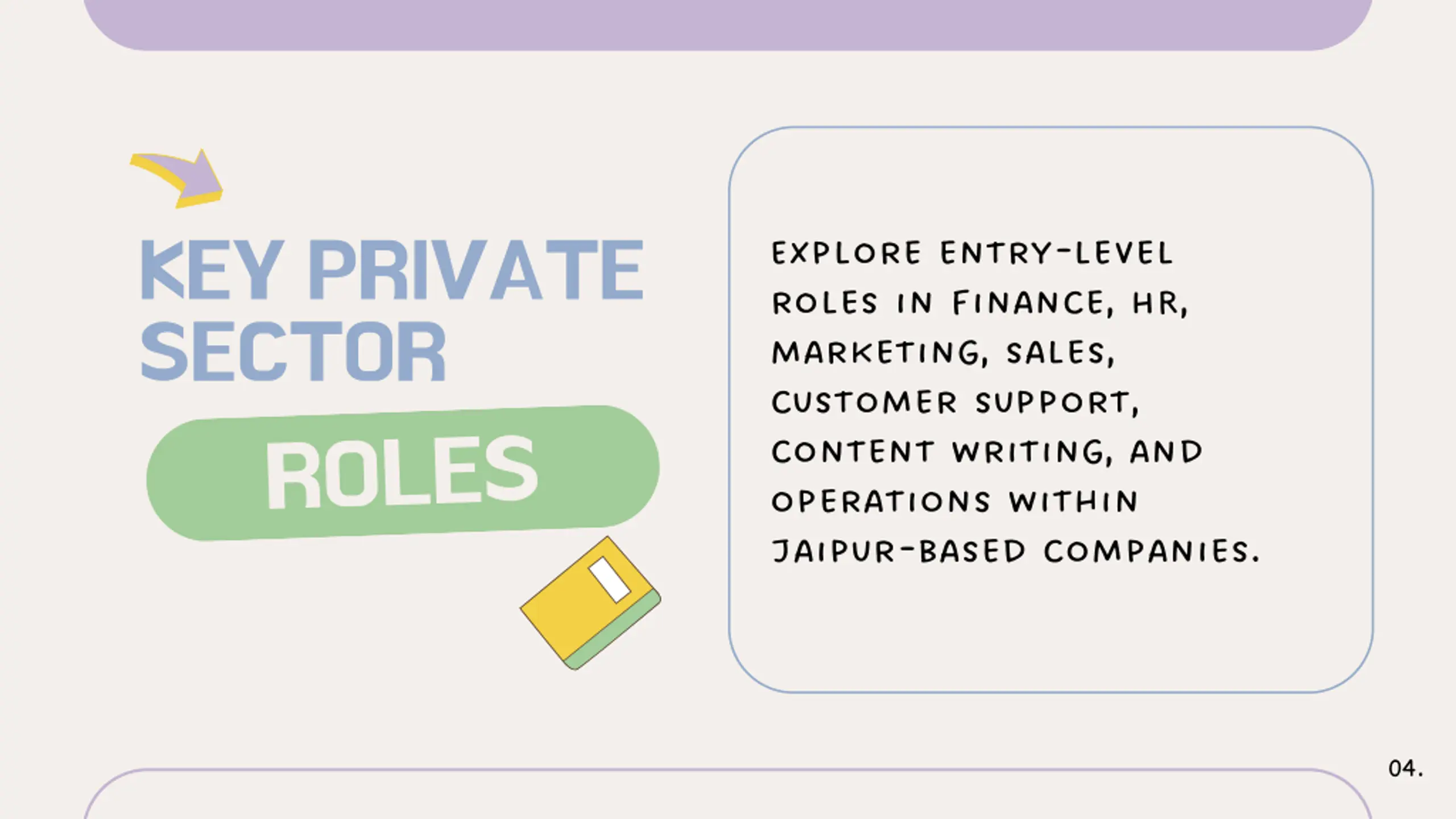 KEYPRIVATE SECTOR Explore entry-level roles in finance, HR, marketing, sales, customer support, content writing, and operations within Jaipur-based companies. ROLES 04.