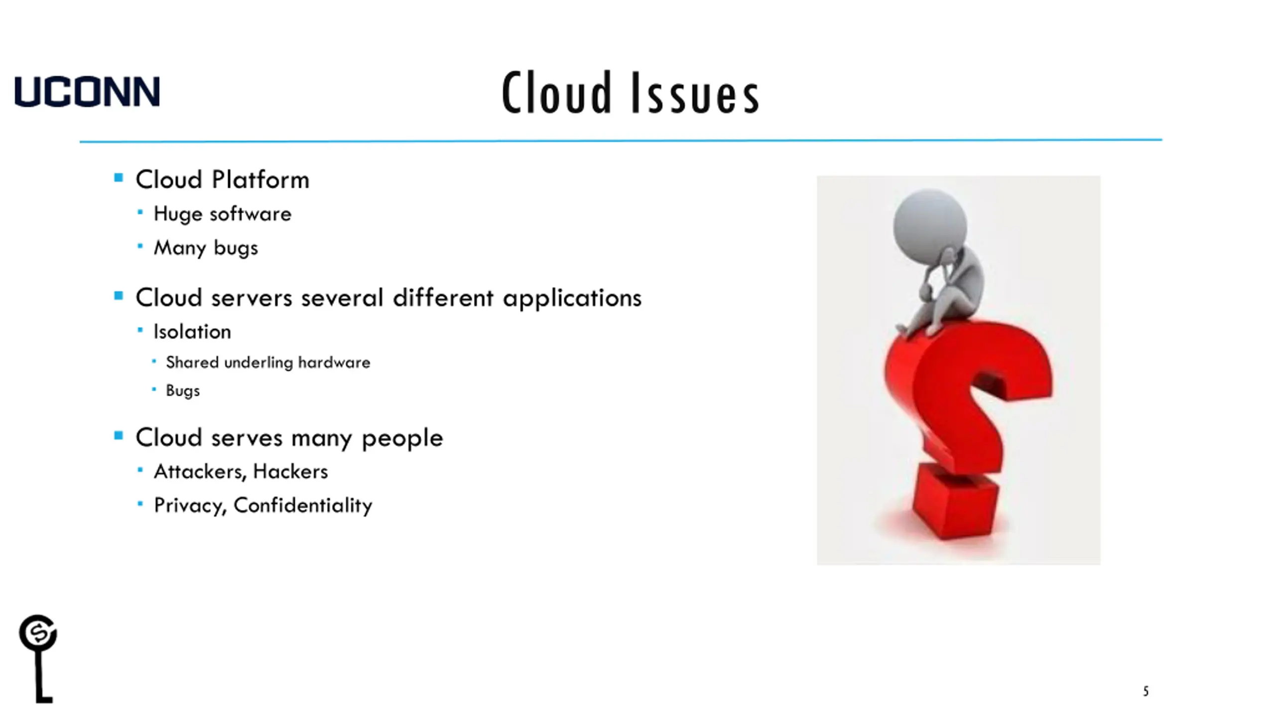 Cloud Issues Cloud Platform Huge software Many bugs Cloud servers several different applications Isolation Shared underling hardware Bugs Cloud serves many people Attackers, Hackers Privacy, Confidentiality 5