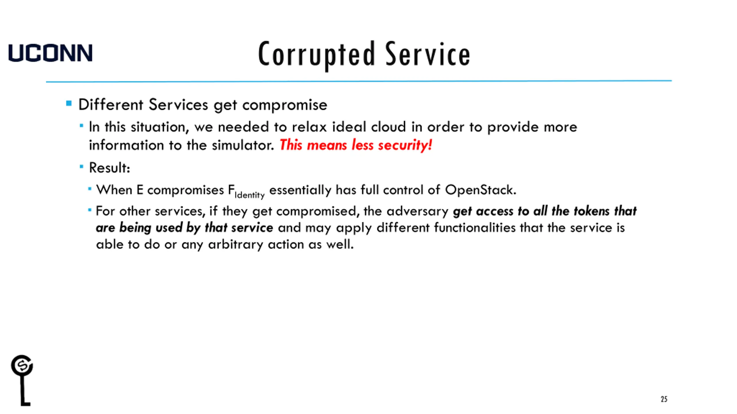 Corrupted Service Different Services get compromise In this situation, we needed to relax ideal cloud in order to provide more information to the simulator. This means less security! Result: When E compromises FIdentity essentially has full control of OpenStack. For other services, if they get compromised, the adversary get access to all the tokens that are being used by that service and may apply different functionalities that the service is able to do or any arbitrary action as well. 25