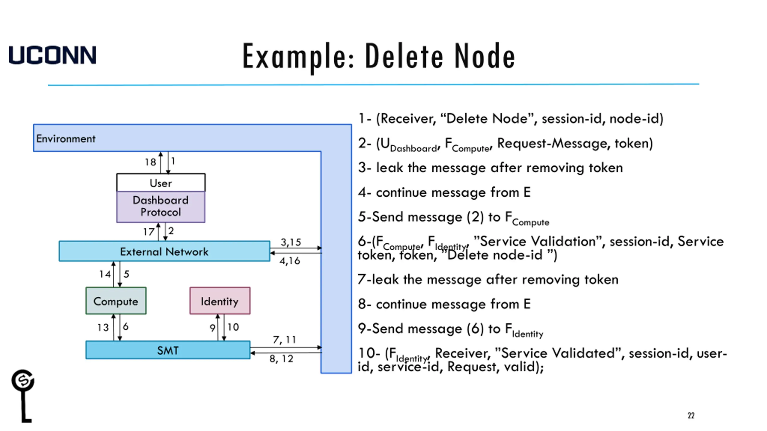 Example: Delete Node 1- (Receiver, Delete Node , session-id, node-id) 2- (UDashboard, FCompute, Request-Message, token) 3- leak the message after removing token 4- continue message from E 5-Send message (2) to FCompute 6-(FCompute, FIdentity, Service Validation , session-id, Service token, token, Delete node-id ) 7-leak the message after removing token 8- continue message from E 9-Send message (6) to FIdentity 10- (FIdentity, Receiver, Service Validated , session-id, user- id, service-id, Request, valid); Environment 1 18 User Dashboard Protocol 2 17 3,15 External Network 4,16 14 5 Compute Identity 6 10 13 9 7, 11 SMT 8, 12 22