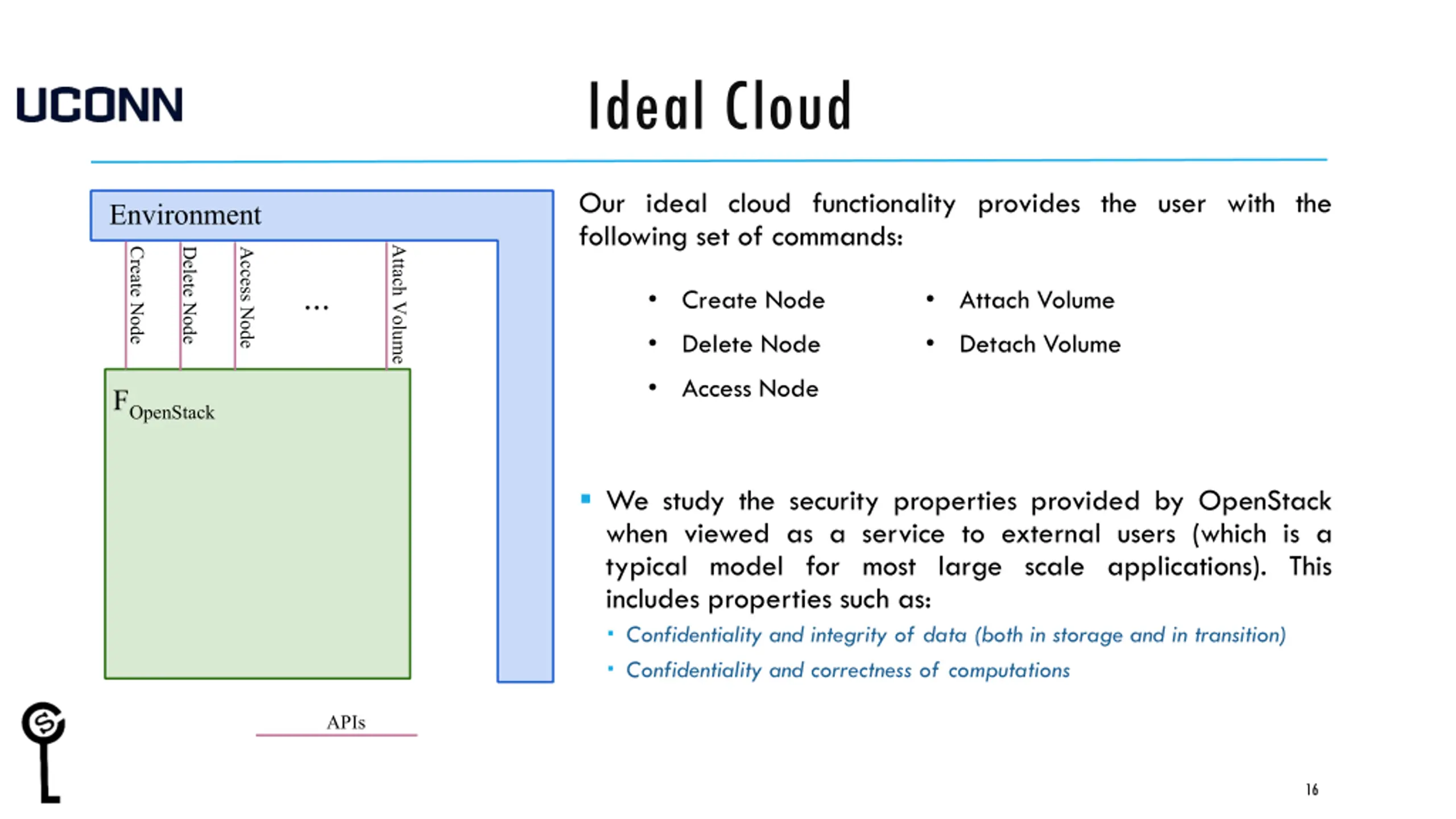 Ideal Cloud Our ideal cloud functionality provides the user with the following set of commands: Environment Create Node Attach Volume Delete Node Access Node Create Node Attach Volume Delete Node Detach Volume Access Node FOpenStack We study the security properties provided by OpenStack when viewed as a service to external users (which is a typical model for most large scale applications). This includes properties such as: Confidentiality and integrity of data (both in storage and in transition) Confidentiality and correctness of computations APIs 16