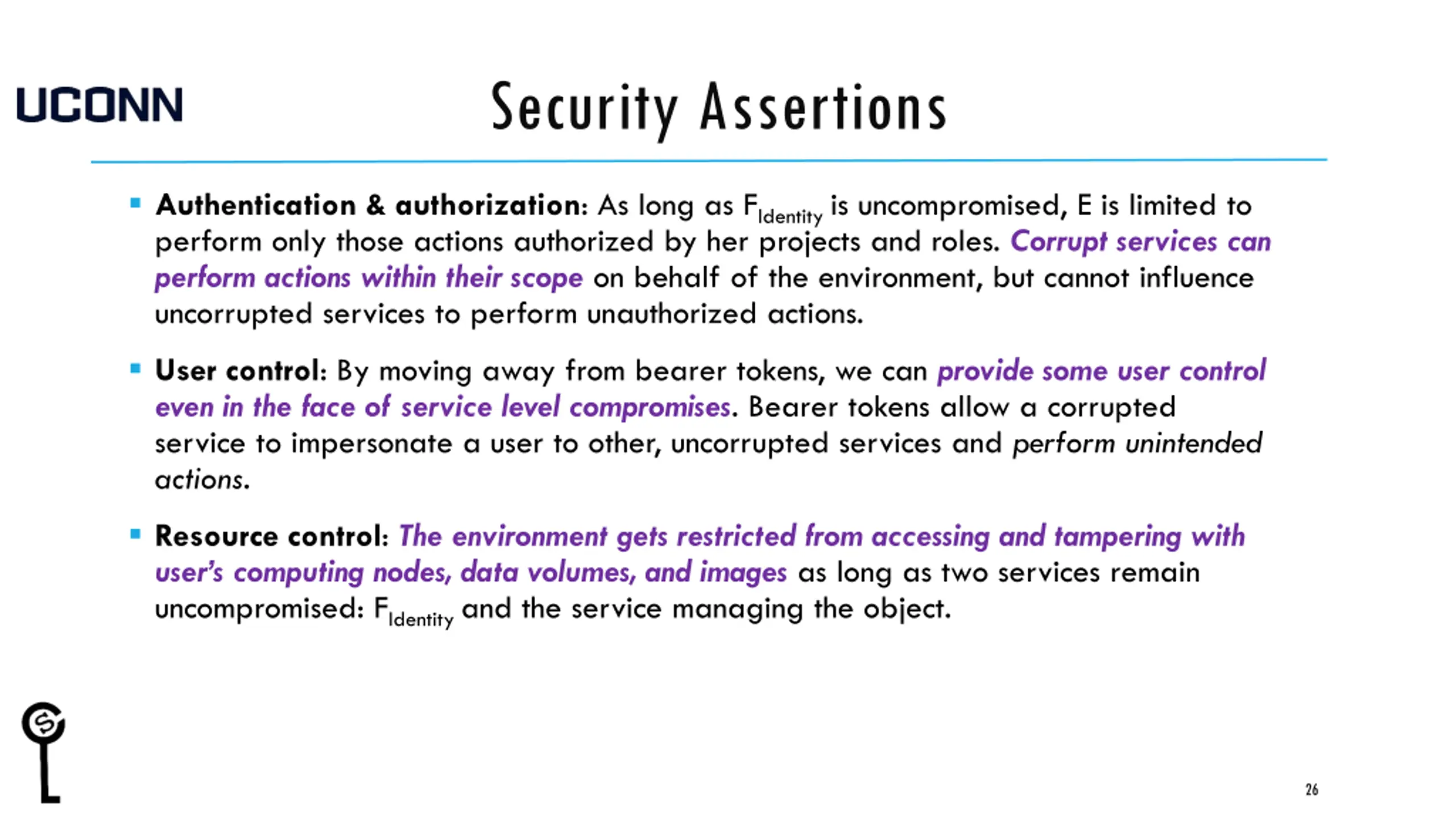 Security Assertions Authentication & authorization: As long as FIdentity is uncompromised, E is limited to perform only those actions authorized by her projects and roles. Corrupt services can perform actions within their scope on behalf of the environment, but cannot influence uncorrupted services to perform unauthorized actions. User control: By moving away from bearer tokens, we can provide some user control even in the face of service level compromises. Bearer tokens allow a corrupted service to impersonate a user to other, uncorrupted services and perform unintended actions. Resource control: The environment gets restricted from accessing and tampering with user s computing nodes, data volumes, and images as long as two services remain uncompromised: FIdentity and the service managing the object. 26