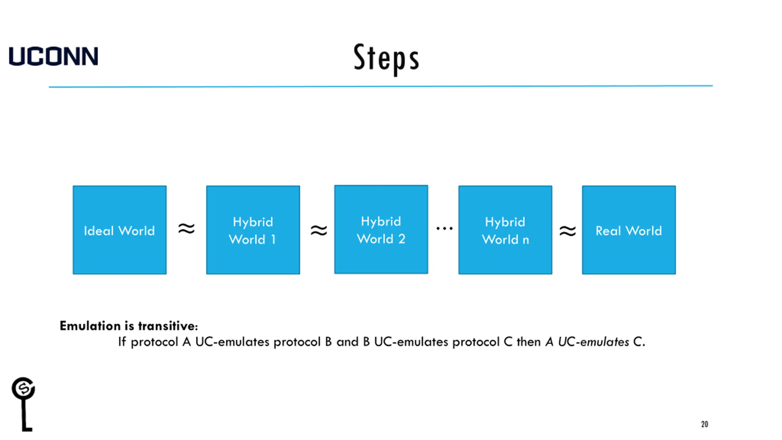Steps Hybrid World 2 Hybrid World 1 Hybrid World n Ideal World Real World Emulation is transitive: If protocol A UC-emulates protocol B and B UC-emulates protocol C then A UC-emulates C. 20