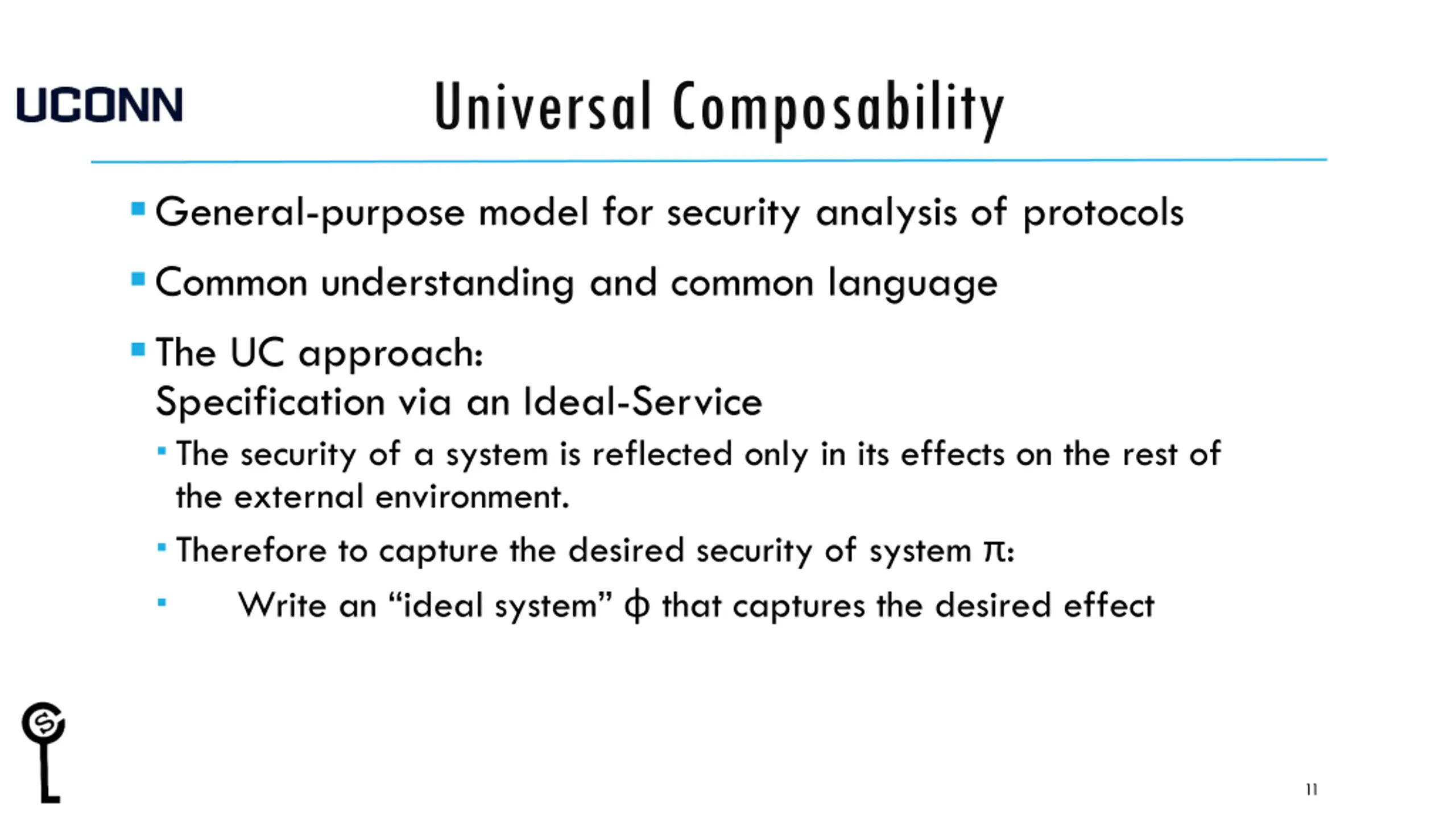 Universal Composability General-purpose model for security analysis of protocols Common understanding and common language The UC approach: Specification via an Ideal-Service The security of a system is reflected only in its effects on the rest of the external environment. Therefore to capture the desired security of system : Write an ideal system that captures the desired effect 10