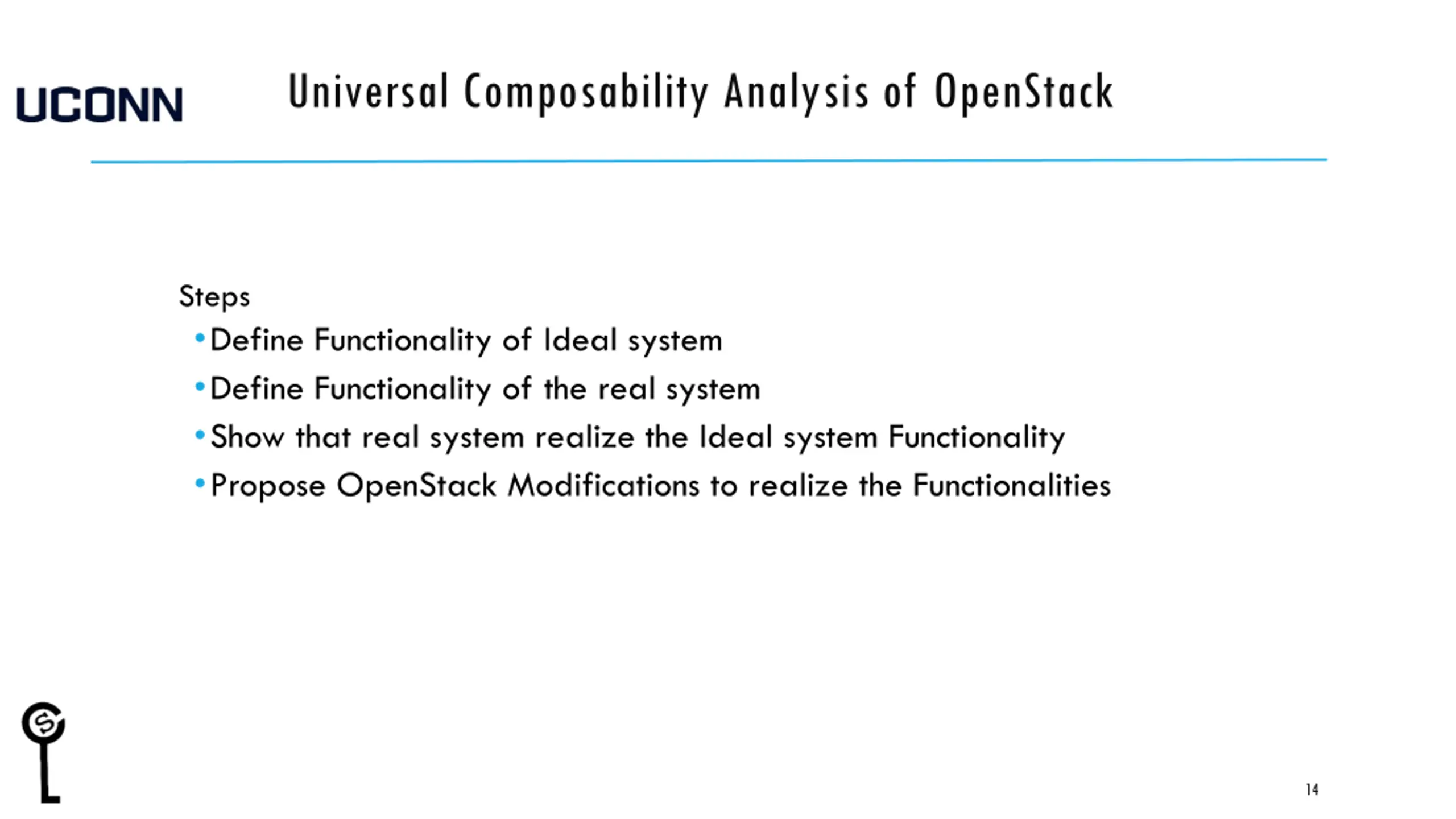 Universal Composability Analysis of OpenStack Steps Define Functionality of Ideal system Define Functionality of the real system Show that real system realize the Ideal system Functionality Propose OpenStack Modifications to realize the Functionalities 14