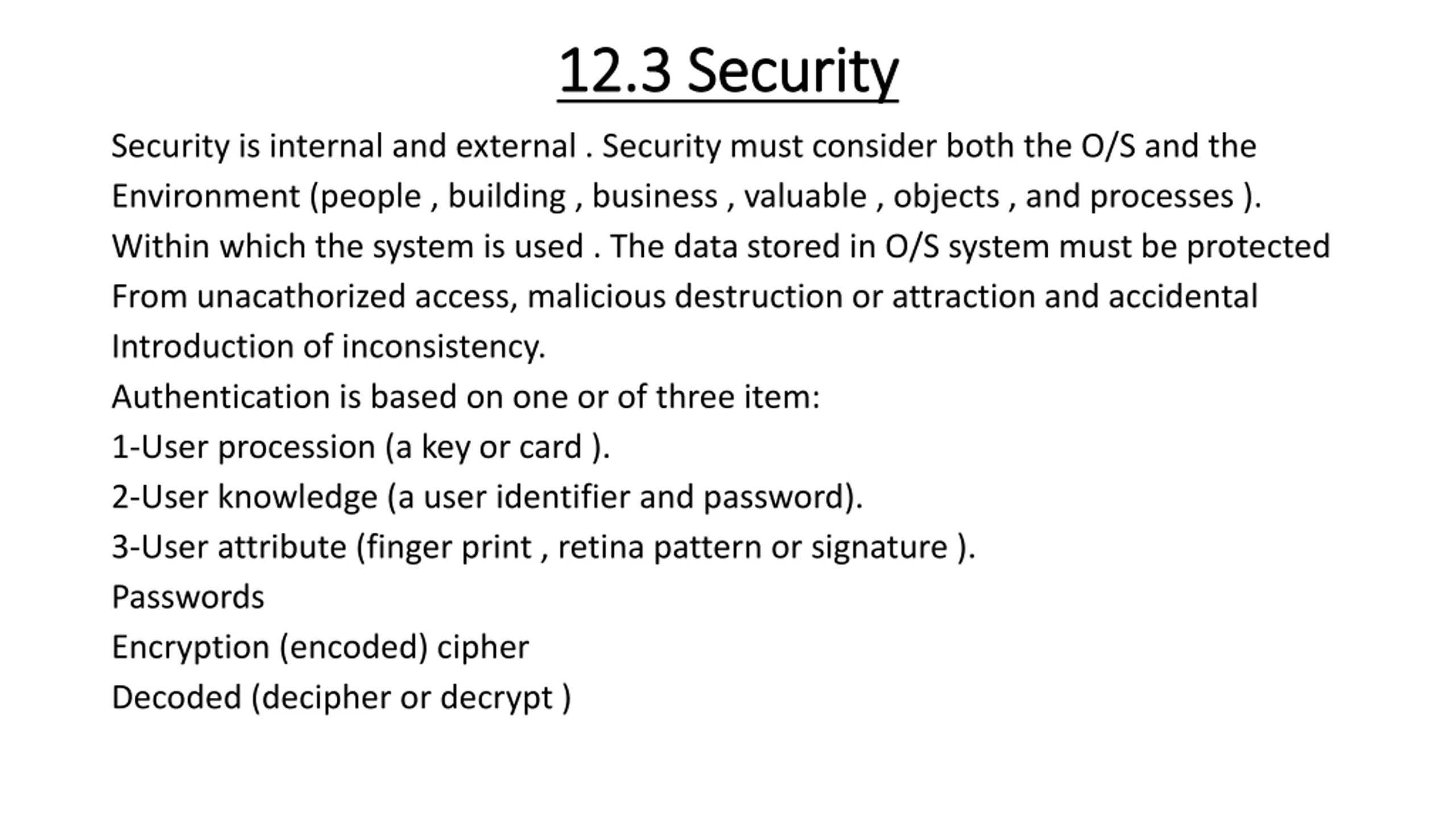 12.3 12.3 Security Security Security is internal and external . Security must consider both the O/S and the Environment (people , building , business , valuable , objects , and processes ). Within which the system is used . The data stored in O/S system must be protected From unacathorized access, malicious destruction or attraction and accidental Introduction of inconsistency. Authentication is based on one or of three item: 1-User procession (a key or card ). 2-User knowledge (a user identifier and password). 3-User attribute (finger print , retina pattern or signature ). Passwords Encryption (encoded) cipher Decoded (decipher or decrypt )