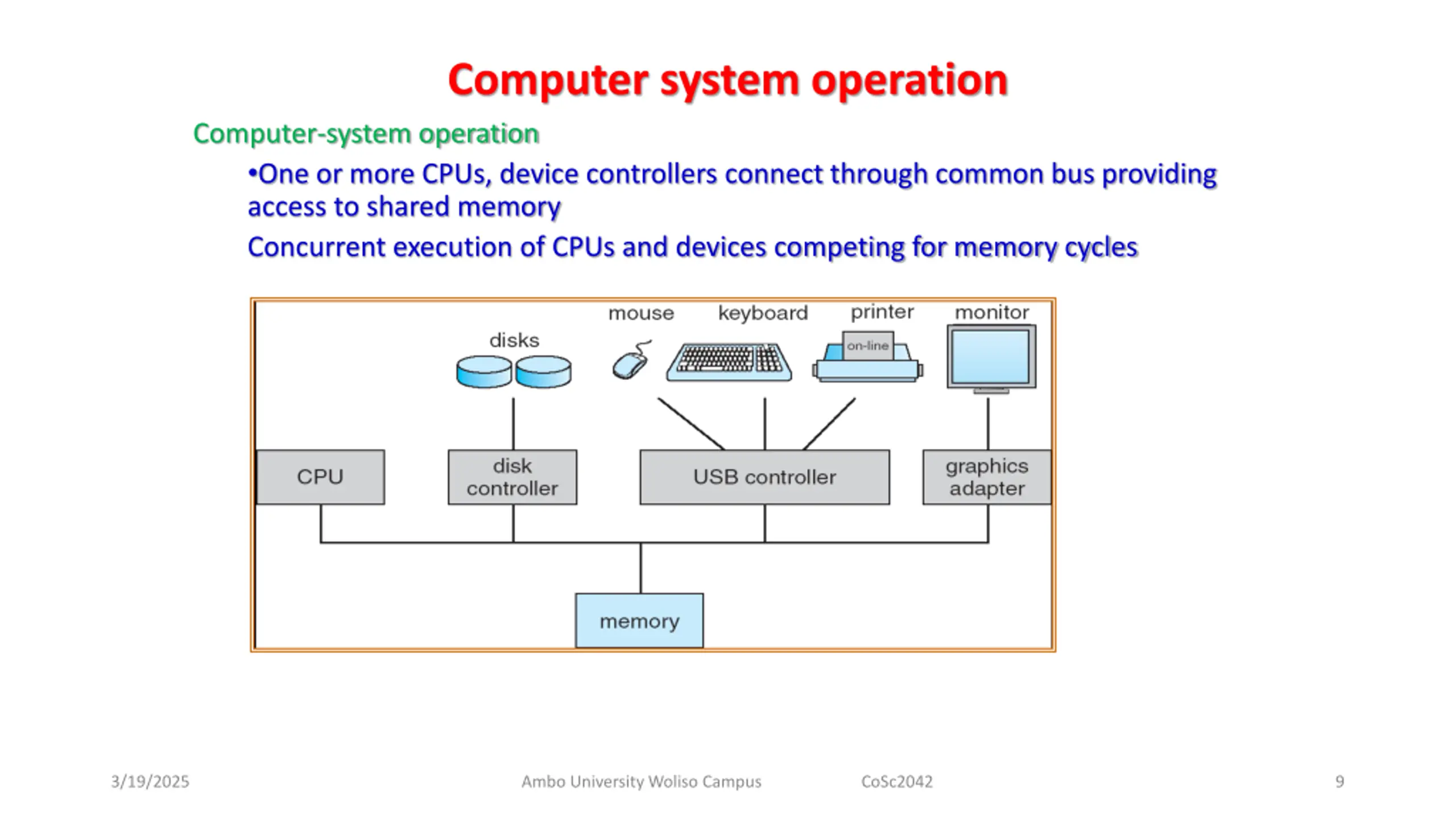Computer system operation Computer-system operation One or more CPUs, device controllers connect through common bus providing access to shared memory Concurrent execution of CPUs and devices competing for memory cycles 3/19/2025 Ambo University Woliso Campus CoSc2042 9