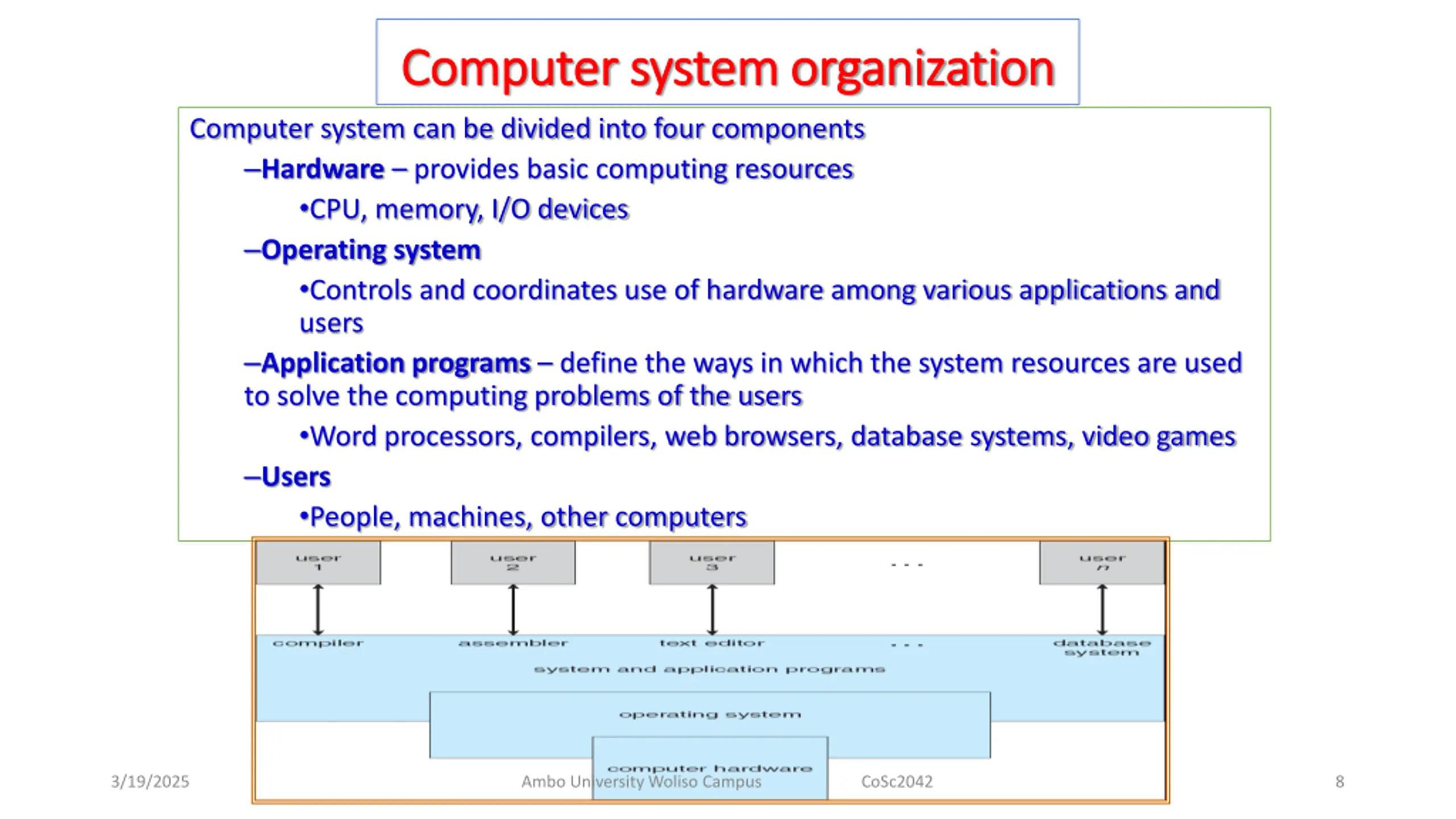 Computer system organization Computer system organization Computer system can be divided into four components Hardware provides basic computing resources CPU, memory, I/O devices Operating system Controls and coordinates use of hardware among various applications and users Application programs define the ways in which the system resources are used to solve the computing problems of the users Word processors, compilers, web browsers, database systems, video games Users People, machines, other computers 3/19/2025 Ambo University Woliso Campus CoSc2042 8