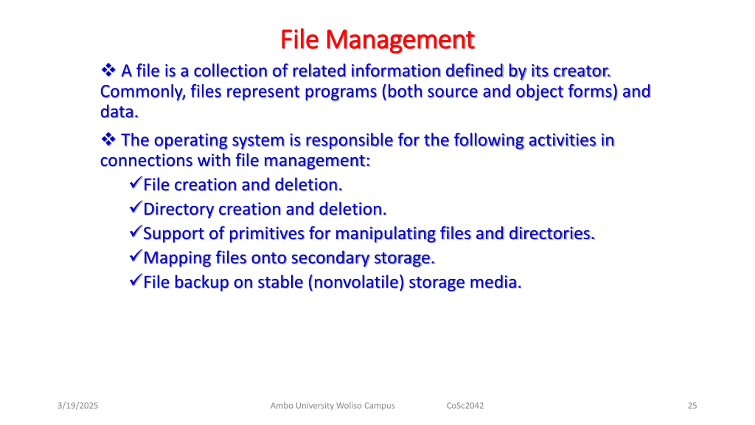 File Management File Management A file is a collection of related information defined by its creator. Commonly, files represent programs (both source and object forms) and data. The operating system is responsible for the following activities in connections with file management: File creation and deletion. Directory creation and deletion. Support of primitives for manipulating files and directories. Mapping files onto secondary storage. File backup on stable (nonvolatile) storage media. 3/19/2025 Ambo University Woliso Campus CoSc2042 25