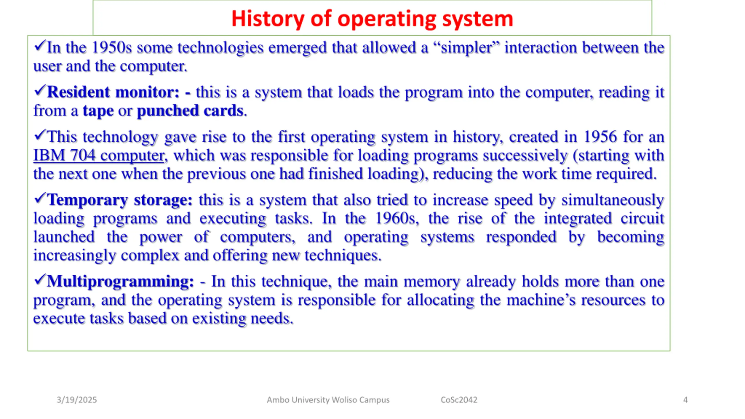History of operating system In the 1950s some technologies emerged that allowed a simpler interaction between the user and the computer. Resident monitor: - this is a system that loads the program into the computer, reading it from a tape or punched cards. This technology gave rise to the first operating system in history, created in 1956 for an IBM 704 computer, which was responsible for loading programs successively (starting with the next one when the previous one had finished loading), reducing the work time required. Temporary storage: this is a system that also tried to increase speed by simultaneously loading programs and executing tasks. In the 1960s, the rise of the integrated circuit launched the power of computers, and operating systems responded by becoming increasingly complex and offering new techniques. Multiprogramming: - In this technique, the main memory already holds more than one program, and the operating system is responsible for allocating the machine s resources to execute tasks based on existing needs. 3/19/2025 Ambo University Woliso Campus CoSc2042 4