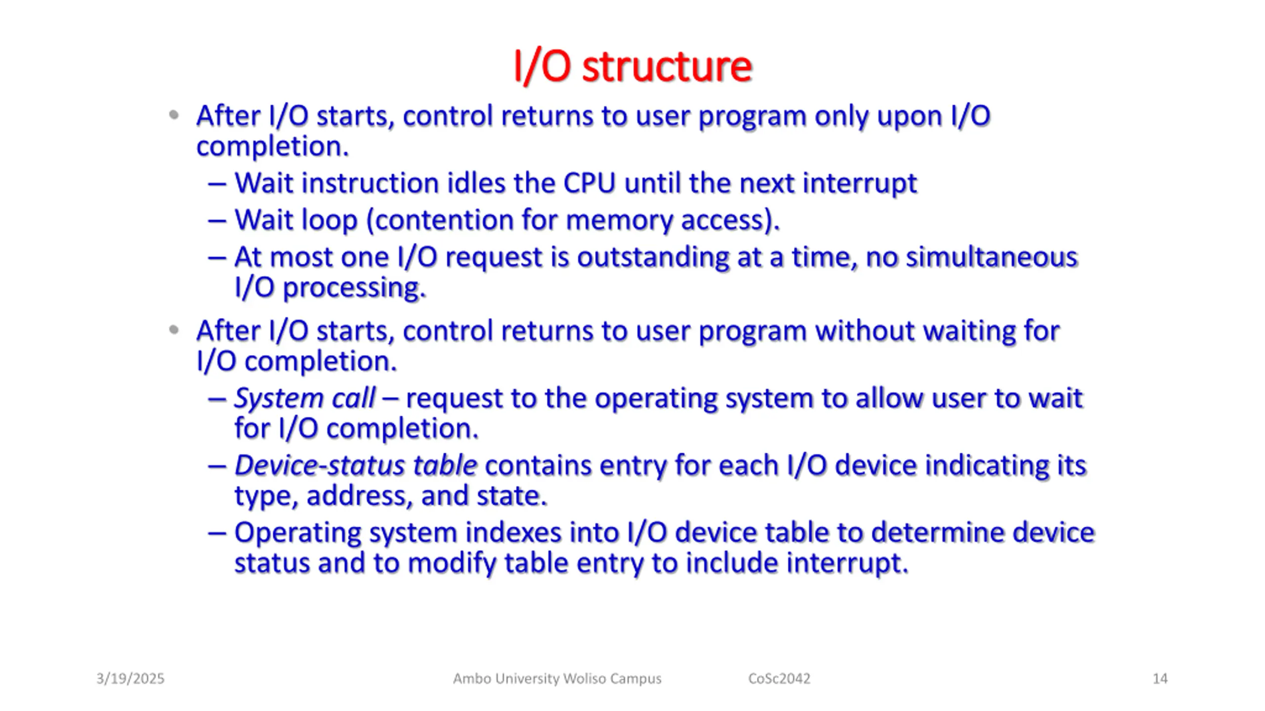 I/O structure I/O structure After I/O starts, control returns to user program only upon I/O completion. Wait instruction idles the CPU until the next interrupt Wait loop (contention for memory access). At most one I/O request is outstanding at a time, no simultaneous I/O processing. After I/O starts, control returns to user program without waiting for I/O completion. System call request to the operating system to allow user to wait for I/O completion. Device-status table contains entry for each I/O device indicating its type, address, and state. Operating system indexes into I/O device table to determine device status and to modify table entry to include interrupt. 3/19/2025 Ambo University Woliso Campus CoSc2042 14