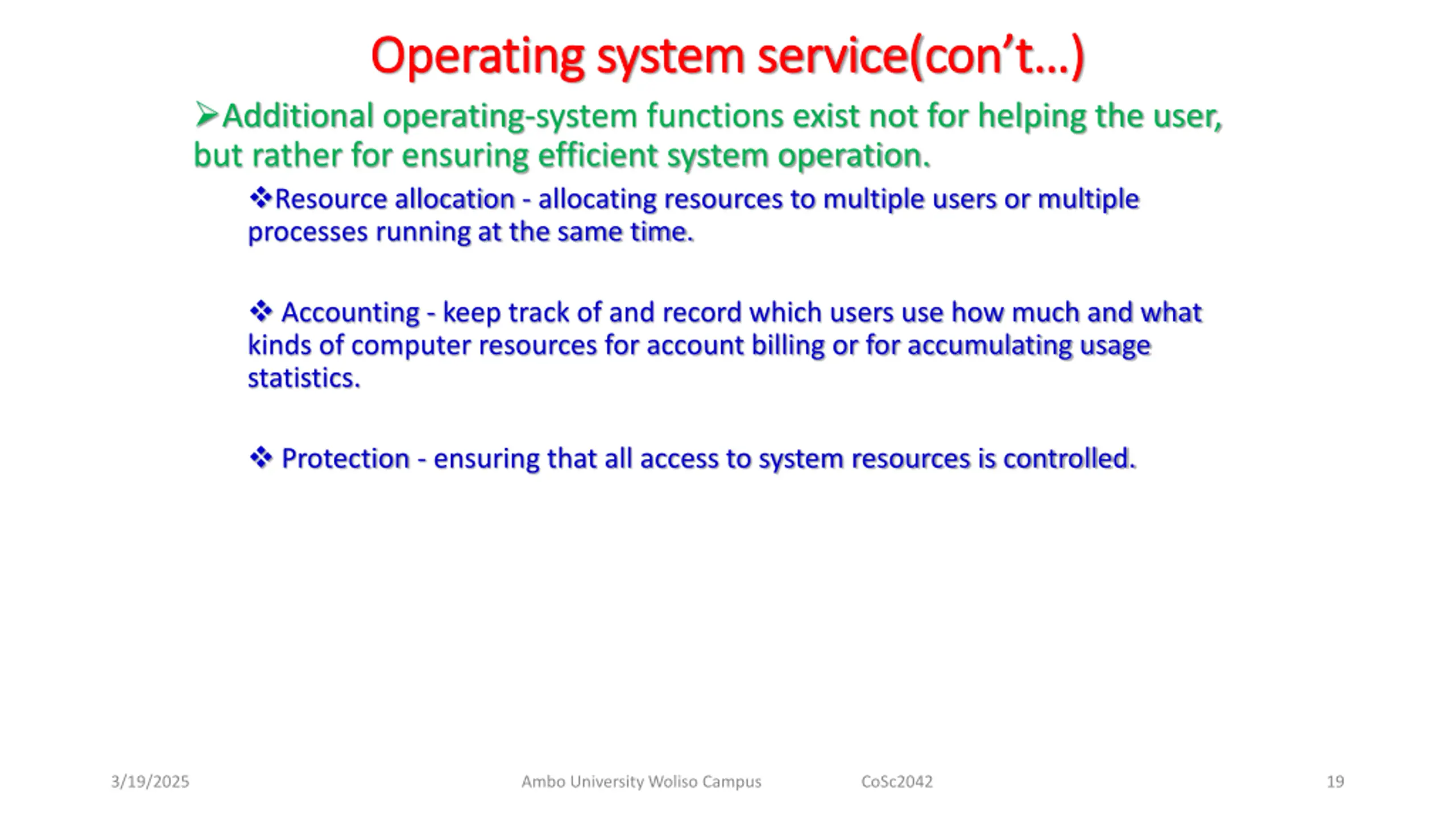 Operating system service( Operating system service(con t Additional operating-system functions exist not for helping the user, but rather for ensuring efficient system operation. Resource allocation - allocating resources to multiple users or multiple processes running at the same time. con t ) ) Accounting - keep track of and record which users use how much and what kinds of computer resources for account billing or for accumulating usage statistics. Protection - ensuring that all access to system resources is controlled. 3/19/2025 Ambo University Woliso Campus CoSc2042 19