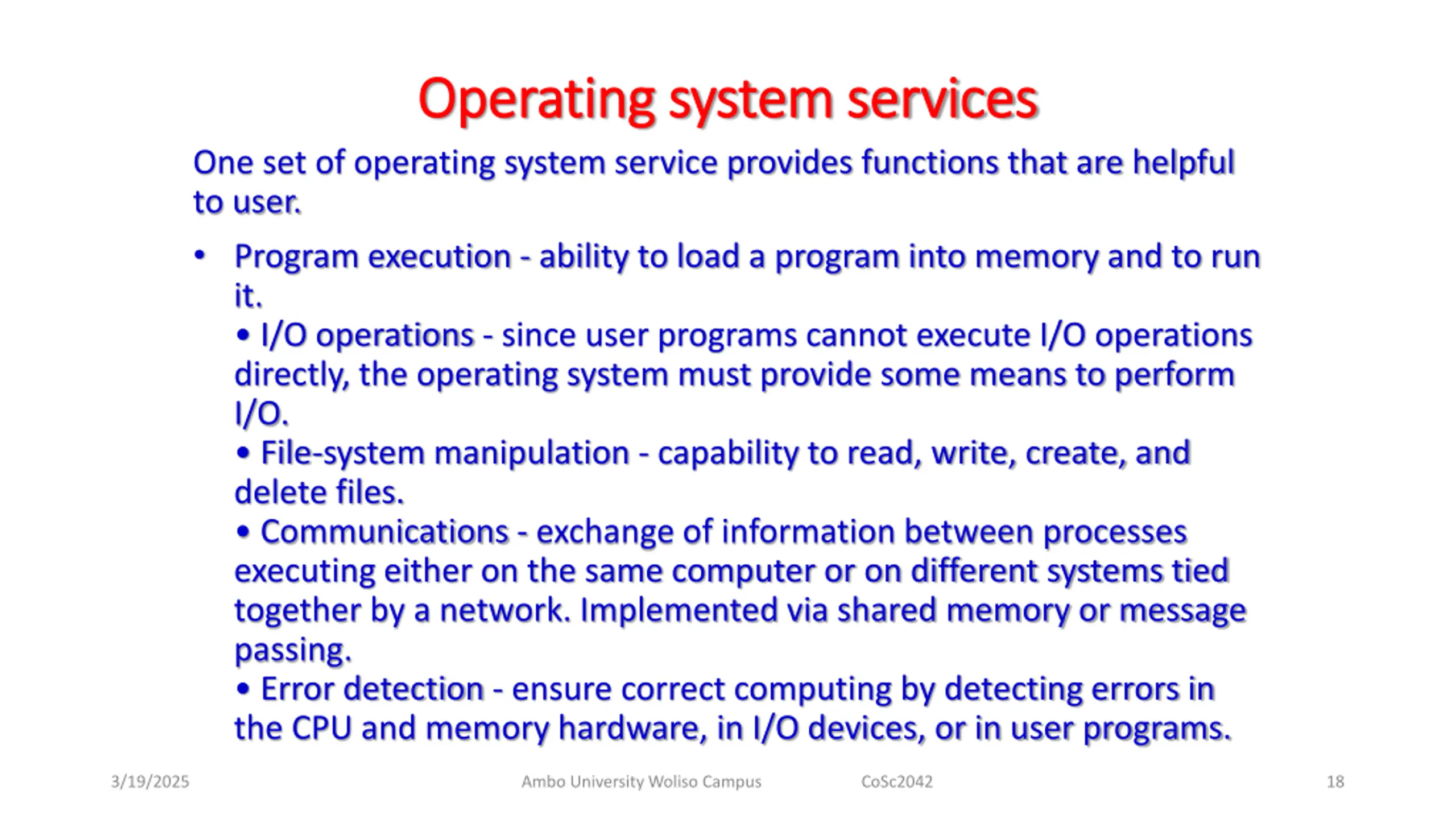 Operating system services Operating system services One set of operating system service provides functions that are helpful to user. Program execution - ability to load a program into memory and to run it. I/O operations - since user programs cannot execute I/O operations directly, the operating system must provide some means to perform I/O. File-system manipulation - capability to read, write, create, and delete files. Communications - exchange of information between processes executing either on the same computer or on different systems tied together by a network. Implemented via shared memory or message passing. Error detection - ensure correct computing by detecting errors in the CPU and memory hardware, in I/O devices, or in user programs. 3/19/2025 Ambo University Woliso Campus CoSc2042 18