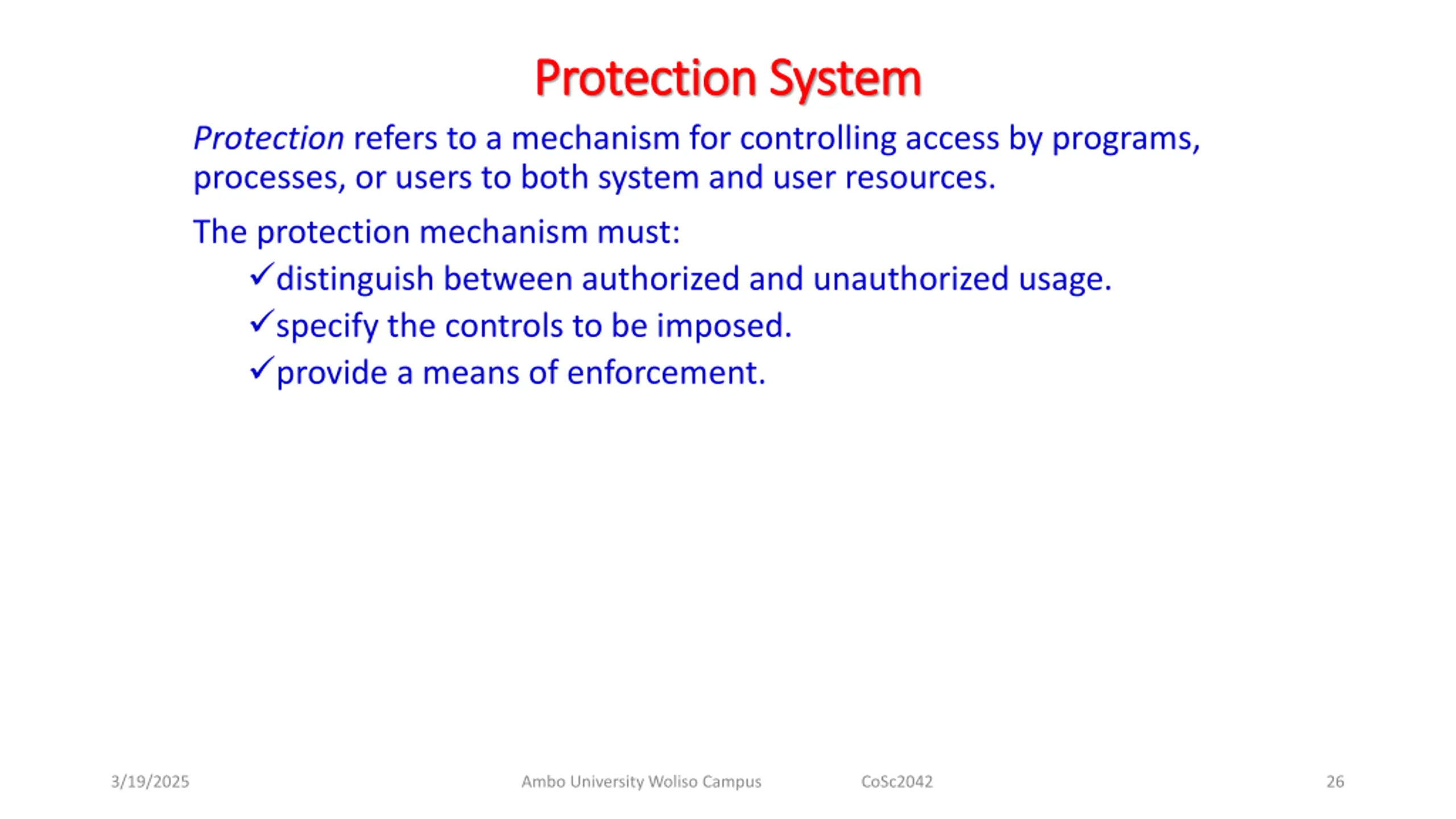 Protection System Protection System Protection refers to a mechanism for controlling access by programs, processes, or users to both system and user resources. The protection mechanism must: distinguish between authorized and unauthorized usage. specify the controls to be imposed. provide a means of enforcement. 3/19/2025 Ambo University Woliso Campus CoSc2042 26